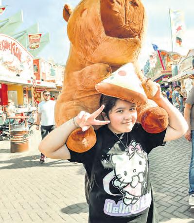 In der Menge hüpft ein riesiges Tier auf und ab. Beim Näherkommen entpuppt es sich als überlebensgroßes Capybara – ein Wasserschwein. Das ist wenigstens niedlich, auch wenn es erstaunlicherweise ein Stück Pizza in den Pfoten hält und fast so groß ist wie seine Besitzerin, Almina Imal. Die Zwölfjährige hatte Glück: Mit einem Einsatz von vier Euro hat sie sich das Plüschteil erspielt, das sie gleich an ihre Mutter weitergibt – zum Tragen. Die ist das schon gewohnt, konnte ihre Tochter doch im vergangenen Jahr bereits einen Hauptpreis absahnen, einen Super Mario Yoshi. „Den haben wir aber verkauft“, sagt Serpil Imal. Verkaufen kommt für Familie Lamping nicht in die Tüte: Die zwei Jungs, ihre Eltern