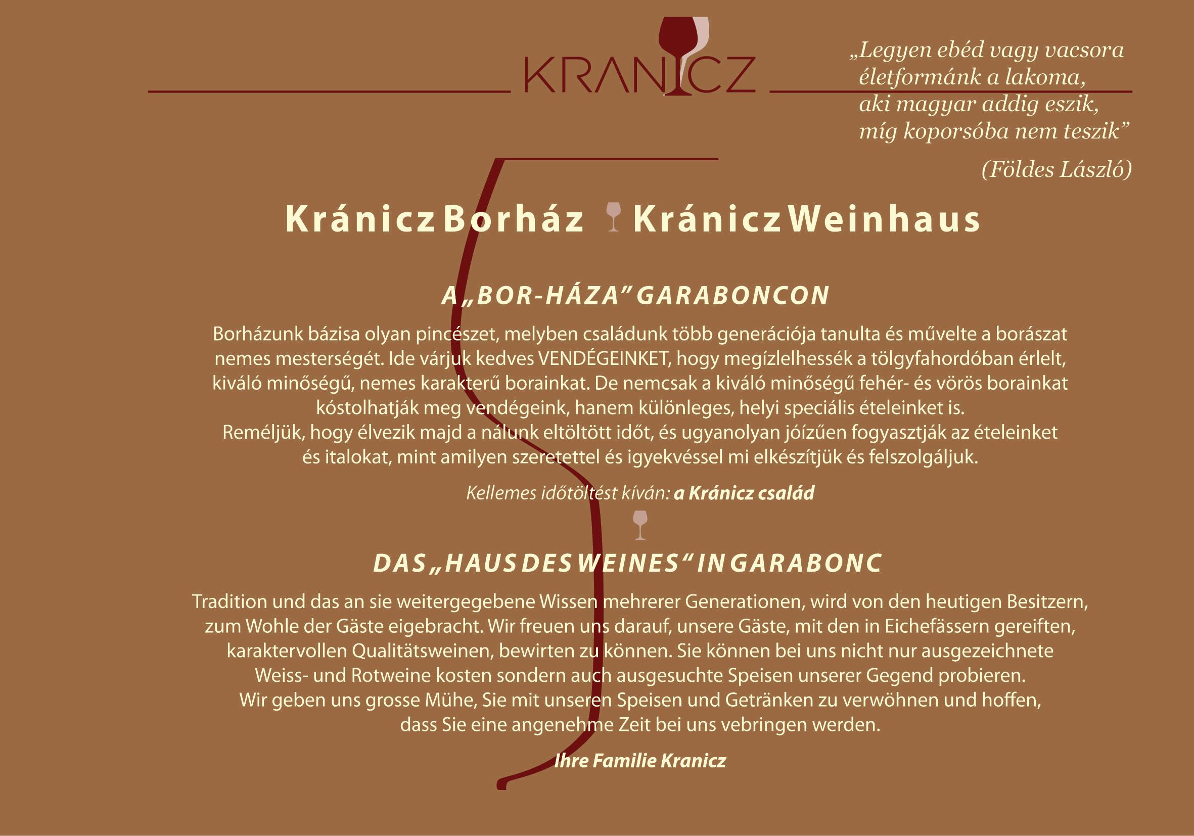 A zalai dombság szívében, Garabonc panorámás lankáin található a Kránicz Borház és Étterem, ahol házias ízekkel, kézműves borokkal és családias hangulattal várjuk kedves vendégeinket.