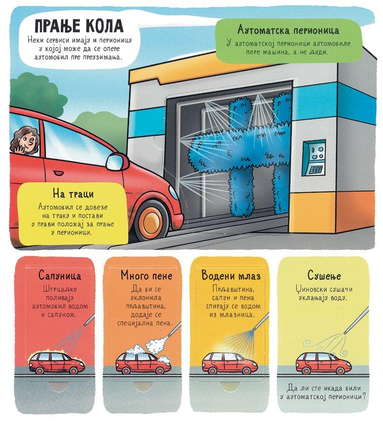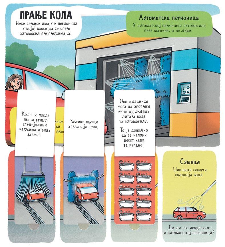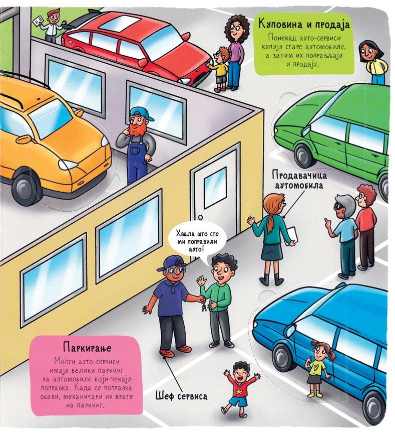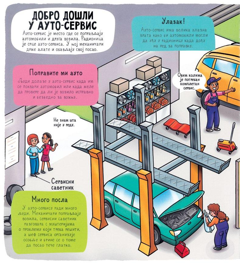 U ovoj knjizi za najmlađe iz edicije "Mali istraživači" dete će imati priliku da sazna šta šta se dešava u auto-servisu i upozna ljude koji tamo rade. Otvaranjem prozorčića otkriće kako izgleda unutrašnjost vozila, kako se popravljaju različiti kvarovi na automobilima i kako se ukazuje pomoć na putu kada se kola pokvare. Postoji mnogo toga što treba istražiti!