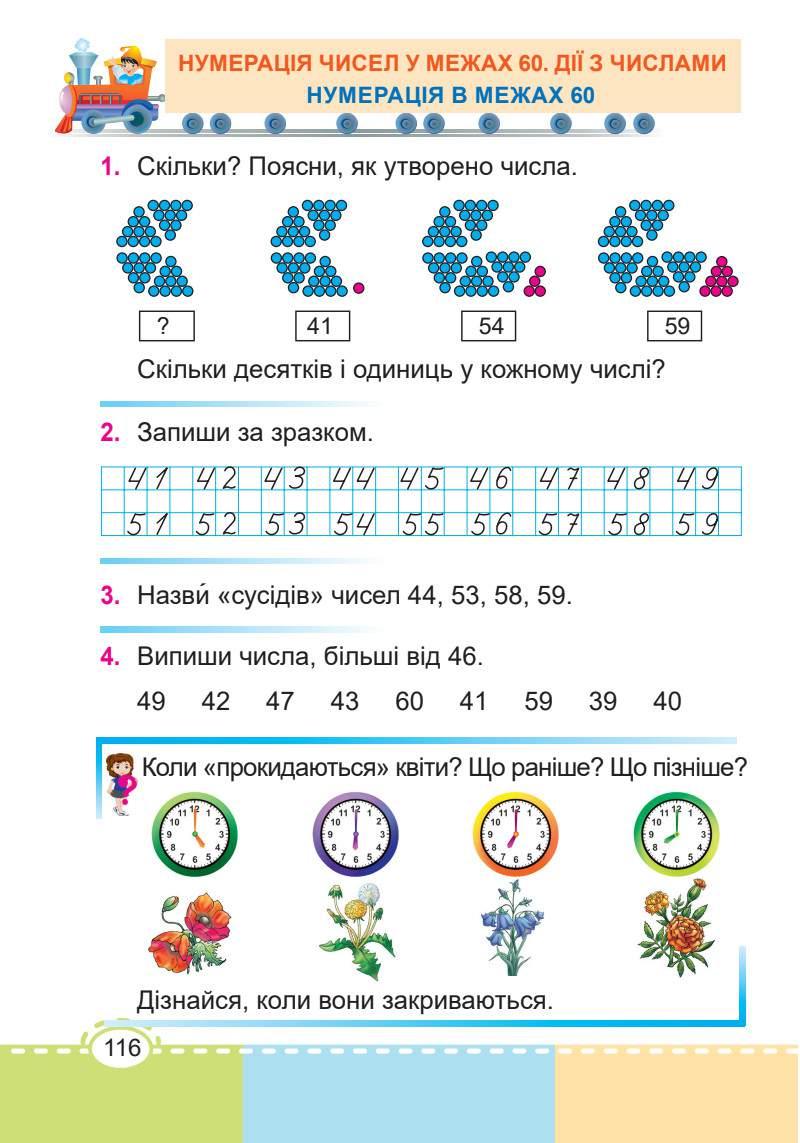 Відповідно до мети уроку, інтелектуальних можливостей і потреб дітей до вправ підручника можна добирати розширену систему завдань і запитань: «Що зображено?», «Скільки?», «Які предмети за розміром; за кольором; призначенням?», «Як розміщені?», «Порівняй за кількістю, за іншими властивостями», «Збільш (зменш) на кілька одиниць», «Де більше (менше)?», «На скільки більше (менше)?», «Зміни числа (збільш, зменш)», «Знайди значення утворених виразів» тощо.