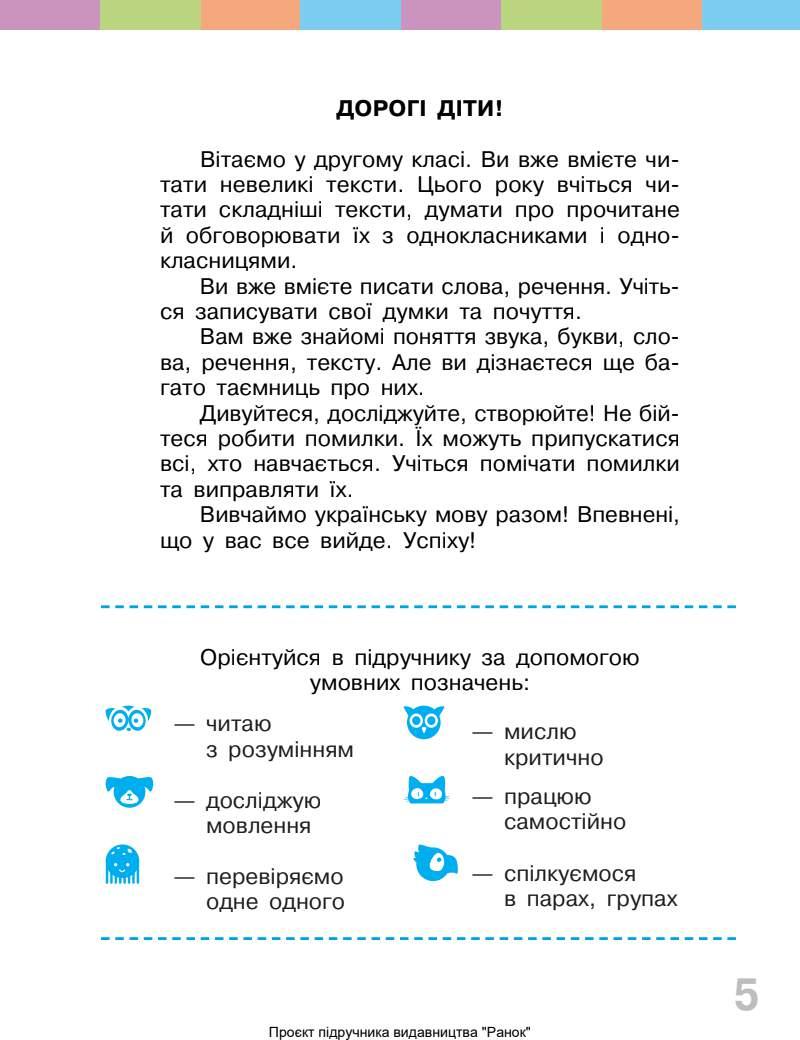 Особливості підручника: тексти різних типів і завдання для їх аналізу завдання для розвитку усного і писемного мовлення вправи для формування орфографічних й орфоепічних умінь система різнорівневих завдань ілюстративний матеріал для формування читацької мотивації візуалізація правил система різнорівневих завдань вправи для розвитку емоційного інтелекту