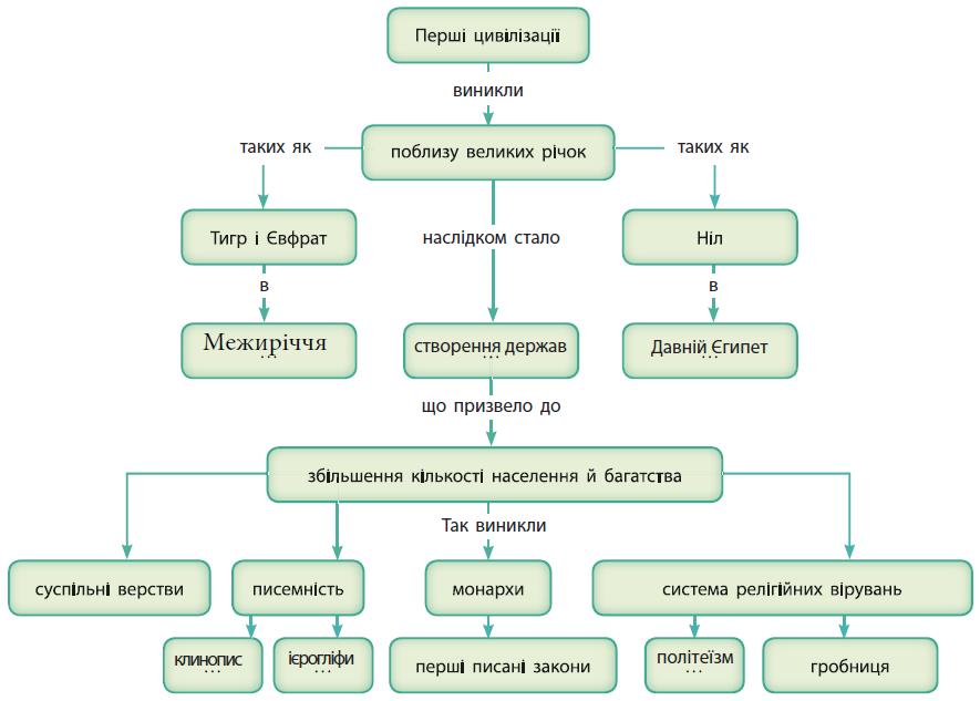 ГДЗ Всесвітня історія. Історія України 6 клас Гісем 2019 Сторінка 4 Що таке цивілізація? Цивілізація - це рівень досягнень людської спільноти в певному історичному часі на певній території, а саме рівень організації цієї спільноти, її господарства, побуту та культури. Який рік ближчий до сучасності: 340 р. до н. е. чи 920 р. до н. е.? ближче 340 рік до н.е., бо відлік часу до нашої ери ведеться в зворотному напрямку - чим менший рік, тим він ближче до нас. 340 р. до н. е. чи 920 р. н. е.? ближче 920 рік, бо він нашої ери, і відлік часу ведеться в звичайному для нас напрямку. Визначте, до якого століття та тисячоліття належать 340 р. до н. е., 900 р. н. е., 2989 р. до н.е., 1880 р. н.е., 2 р. н. е. 340 р. до н.е. - IV ст. до н. е., І тис. до н.е. 900 р. н.е. – X ст. н. е., І тисячоліття н.е. 2989 р. до н.е. - XXX ст. до н. е., ІII тис. до н.е. 1880 р. н.е. - XIX століття н. е., ІI тис. н.е. 2 р. н.е. - I ст. н. е., І тис. н.е. Сторінка 5 Запишіть числа римськими цифрами: 2, 33, 1990, 17, 384, 99, 3598. I = 1, II = 2, III = 3, IV = 4, V = 5, VI = 6, VII = 7, VIII = 8 IX = 9, X = 10, L = 50, C = 100, D = 500, M = 1000 Отже, 2 = II, 33 = ХХХІІІ, 1990 = MCMXC, 17 = XVII, 384 = CCCLXXXIV, 99 = XCIX, 3598 = MMMDXCVIII Сторінка 6 Розв’язання історичних задач 1) Вважається,
