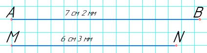 19. АВ = 7 см 2 мм, MN = 6 см 3 мм. AB > MN, оскільки з двох відрізків більшим вважають той, довжина якого більша.
