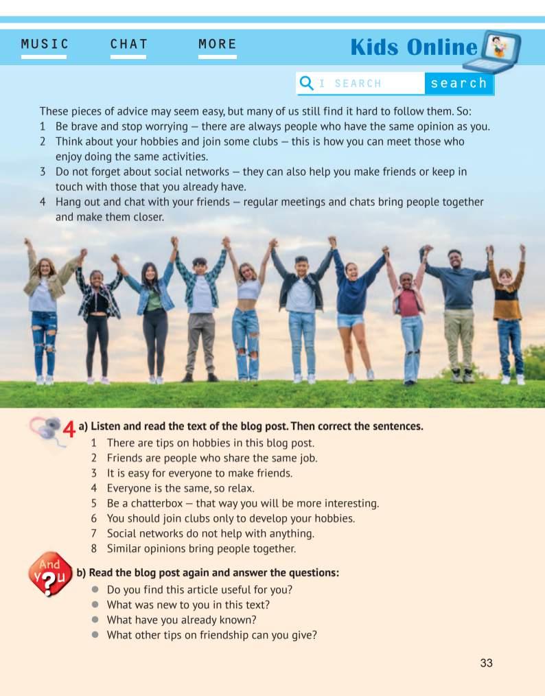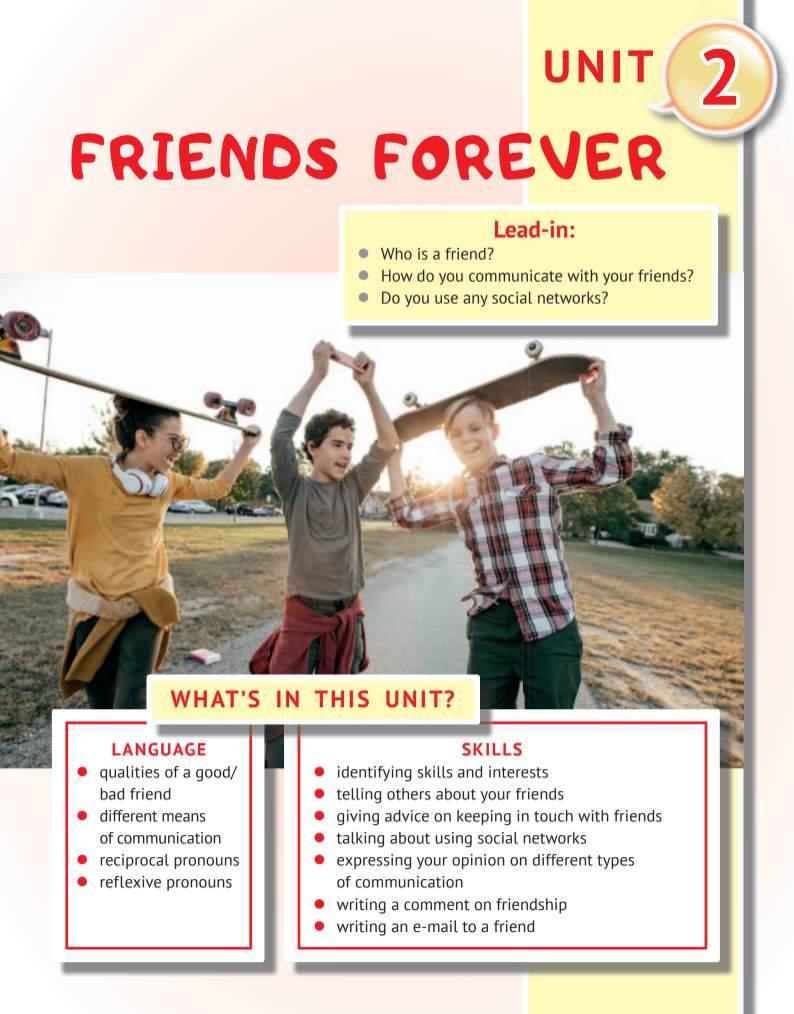 Asking and answering about skills and interests. Giving advice on how to make friends. Expressing an opinion on different types of communication. Describing a friend.