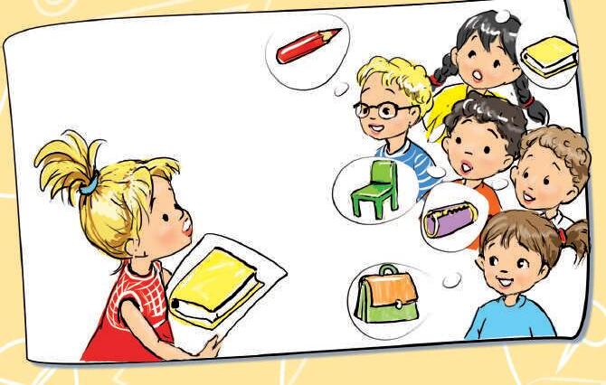Identifying and asking about school things. Following commands. Counting objects. Matching. Creativity: making a school tree, miming, acting out, singing, saying chants, playing guessing games