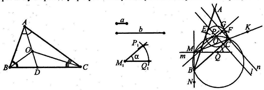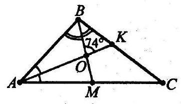 20. У трикутнику ABC відомо, що ∠A = 44°, ∠B = 56°. Бісектриси