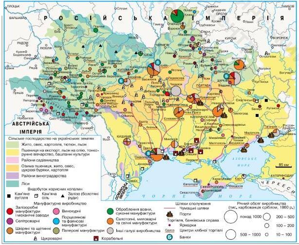 У промисловості переважали мануфактури, багато підприємств належали поміщикам або державі. На карті позначено центри мануфактур.