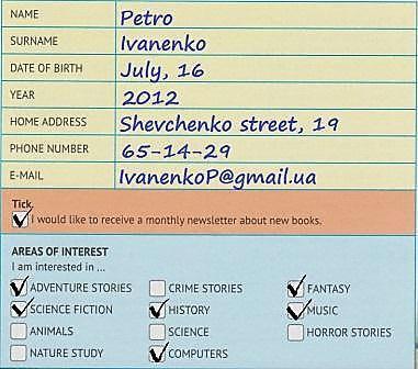 I go to our school library quite often because it is the best place to find books for my studies and hobbies. I joined it three years ago when I started middle school, and I became a regular reader almost immediately. I chose this library because it is very close to my classroom and has a great collection of adventure stories. When I am there, I usually choose books by looking at the new arrivals on the shelves, for example, or by reading the blurbs on the back covers. The librarian is also very friendly; she helps me find specific authors and also gives me great advice when I cannot make a choice. Shkola.in.ua
