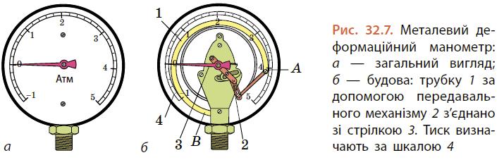 1. Для вимірювання атмосферного тиску використовують: а) ареометр; б) динамометр; в) барометр; г) манометр. Пояснення: Барометр – це прилад для вимірювання атмосферного тиску. Відповідь: в) барометр.