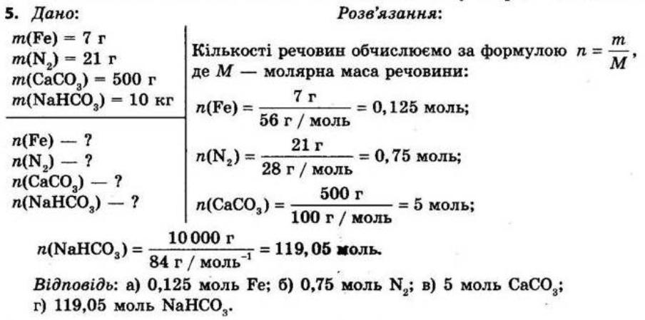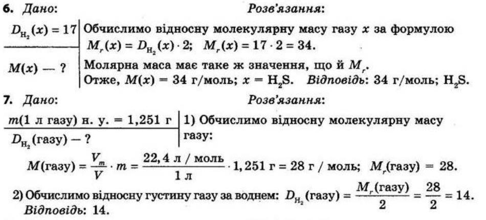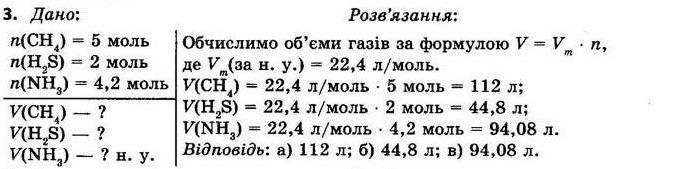 3) Відповідь не зміниться, якщо в умові задачі замінити водень на азот або невідомий газ, тому що за законом Авагадро однакові об’єми різних газів за однакових умов містять однакову кількість молекул. Відповідь зміниться, якщо в умові задачі замінити водень на водопровідну воду. 3. Визначте, який об’єм за нормальних умов займають: а) 5 моль метану CH4; б) 2 моль гідроген сульфіду H2S; в) 4,2 моль амоніаку NH3.