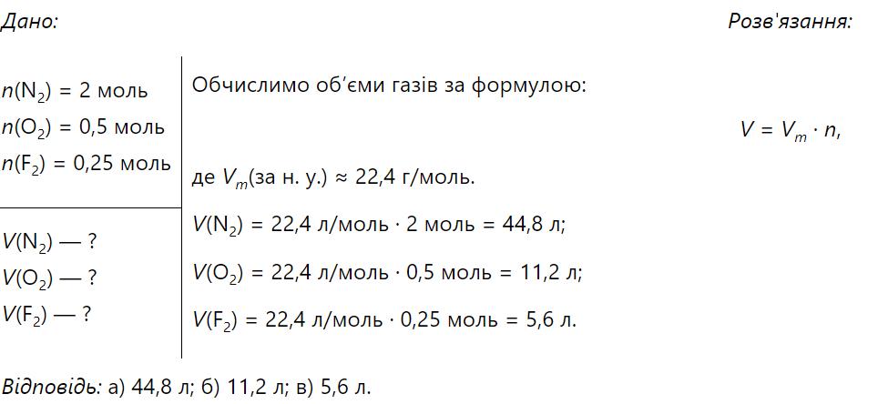 1. Який об’єм займають за нормальних умов: а) 2 моль азоту; б) 0,5 моль кисню; в) 0,25 моль фтору?