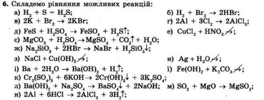 окиснення –2. До оксидів належать CO2 — карбон(IV) оксид, SO3 — сульфур(VI) оксид. Кислоти — складні речовини, які складаються з атомів Гідрогену і кислотних залишків. До кислот належать НCl — хлоридна кислота, H2SO4 — сульфатна кислота, HBr — бромидна кислота, Н3РО4 — ортофосфатна кислота, H2SiO3 — силікатна кислота, H2S — сульфідна кислота, HI — йодидна кислота. Основи — складні сполуки, що містять металічні елементи та одну або кілька гідроксильних груп — ОН. До основ належать NaOH — натрій гідроксид, Са(ОН)2 — кальцій гідроксид, Cu(OH)2 — купрум(ІІ) гідроксид, Fe(OH)2 — ферум(ІІ) гідроксид, Mg(OH)2 — магній гідроксид, Zn(OH)2 — цинк гідроксид. Солі — складні сполуки, що містять металічні елементи й кислотні залишки. До солей належать K2SO4 — калій сульфат, CaBr2 — кальцій бромід, CuCO3 — купрум(ІІ) карбонат, AlРО4 — алюміній ортофосфат, CuSO4 — купрум(ІІ) сульфат, Ba(NO3)2 — барій нітрат, FeCl, — ферум(ІІІ) хлорид, Na2S — натрій сульфід, Al(NO3)3 — алюміній нітрат, Ва3(РО4)2 — барій ортофосфат.