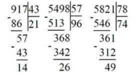 2000 : 58 = 34 (ост. 18) 5006 : 96 = 52 (ост. 14) 3059 : 36 = 84 (ост. 35)