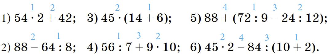 2) (45+5) : 10·4 + 12; 1) 45+5=50, 2) 50:10=5, 3) 5·4=20, 4) 20+12=32.