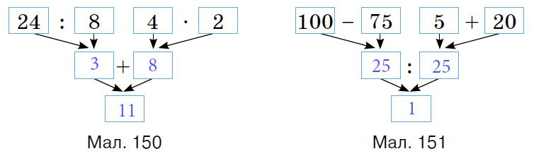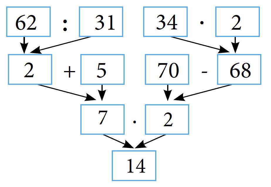 1) (24:8+14)·2-15; 1) 24:8=3, 2) 3+14=17, 3) 17·2 = 34, 4) 34-15 = 19