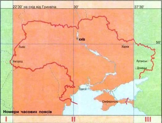 3. Використовуючи схему, проведіть на контурній карті «Фізична карта України» (с.15) лінії меридіанів, які є межами годинних поясів, що проходять через територію України.