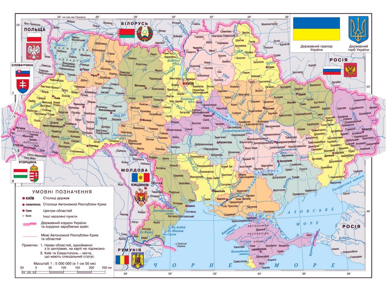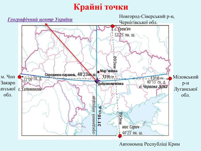 2. Користуючись фізичною картою, визначте координати крайніх точок України.