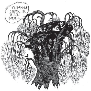 привид, за ним пливли мужні, хоча й напівпрозорі козаки, полеглі в Хотинській битві, і бронзовий гетьман на горі радо вітав своє славне товариство. Не тямлячись від переляку, дебелий парубійко якось боком посунувся до свого автомобіля і за хвильку сидів у