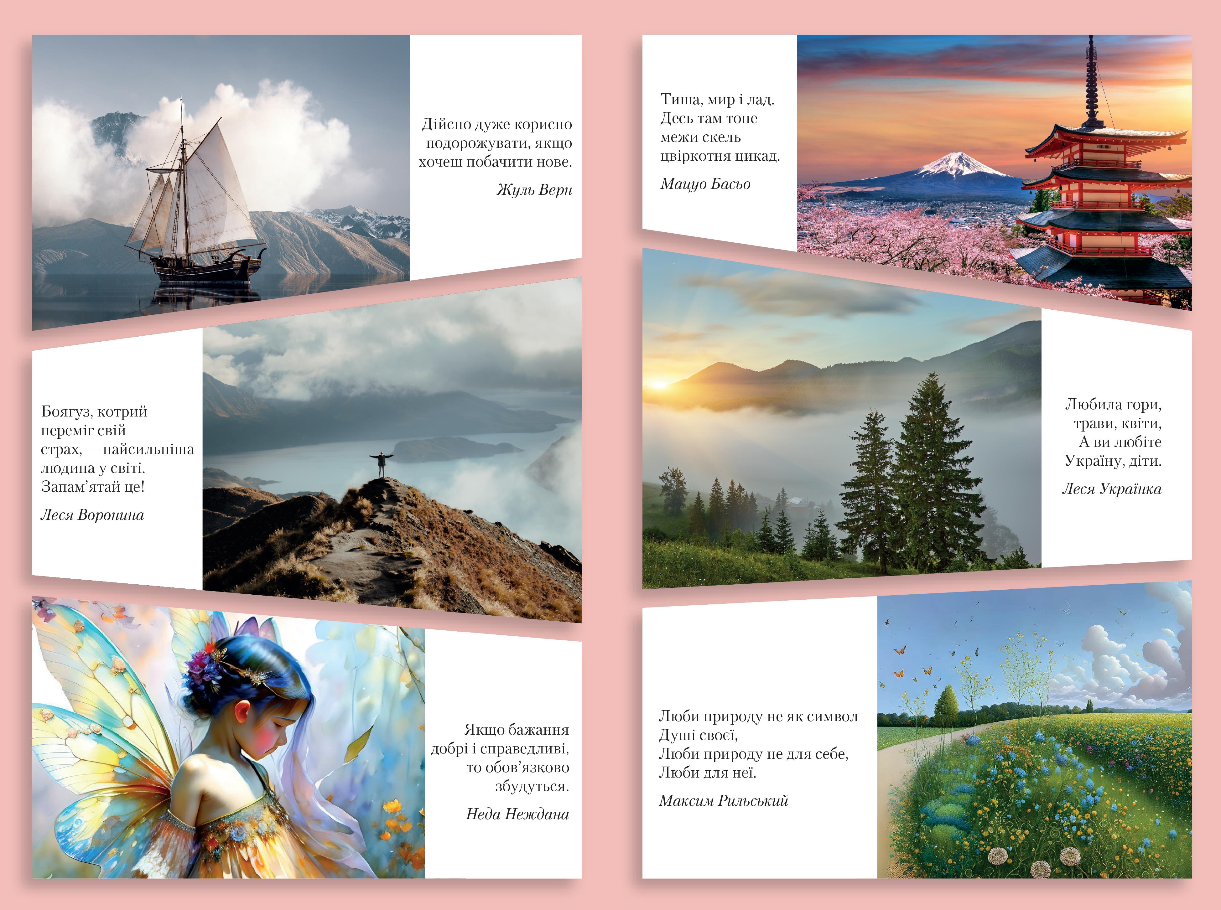 краса морської тиші в Криму, змальована Лесею Українкою. Ти пізнав / пізнала красу осінніх пейзажів, зображених Максимом Рильським. Микола Вінграновський розповів тобі, як літнього вечора «гусеня хмарини плутається в житі». Ліна Костенко здивувала незвичайними образами літнього дощу: «день полив’яний», після зливи «струшується сад, як парасолька», «квасолька корів», що розсипалася полями. Джанні Родарі подарував тобі прекрасні листівки, і ти зміг / змогла помилуватися краєвидами мальовничих італійських міст, а на звороті цих глянцевих шедеврів побачити щоденну рутинну працю простих людей.