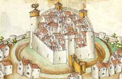 Пригадайте особливості забудови середньовічних міст. Уважно розгляньте малюнок і визначте елементи, з яких складалися середньовічні замки-фортеці. Складіть коротку розповідь про середньовічний замок.