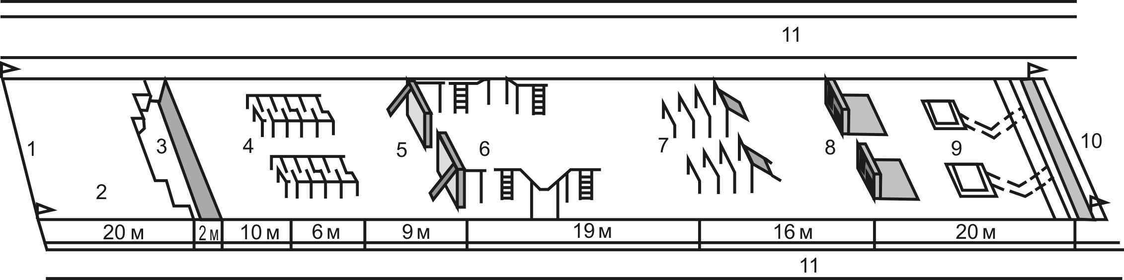 Іл. 62.6. Рубіж відкриття вогню вогонь» та виставляють білий прапор замість червоного. За командою «Стій! Припинити вогонь» ті, хто стріляє, припиняють вогонь. Зброю розряджають. Зброю дозволяють заряджати тільки на рубежі відкриття вогню ( іл. 62.6 ). У вихідне положення стрільці повертаються тільки за командою керівника.
