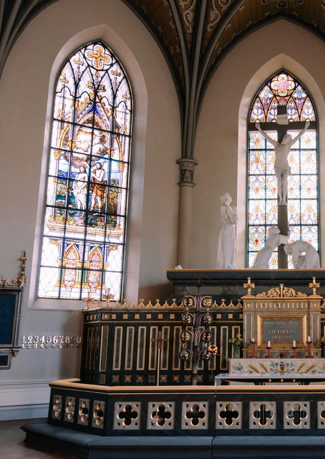 SEVÄRDHETER Den pampiga altargruppen med figurer i naturlig storlek och innertaket som är täckt med målade scener ur bibeln - låna en kikare så du kan titta närmare. Ett bildspel berättar mer om kyrkans inventarier. På kyrkogården intill kyrkan kan du läsa på gravstenarna vilka yrken som fanns förr, känner du igen alla?