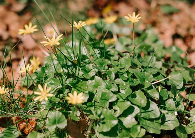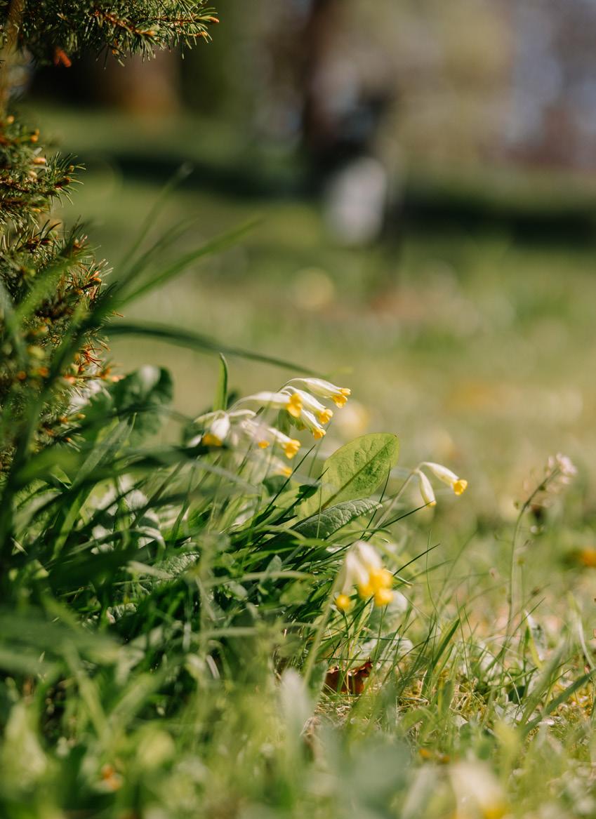 gullvivor och liljekonvalj är några av alla blommor som pryder marken.
