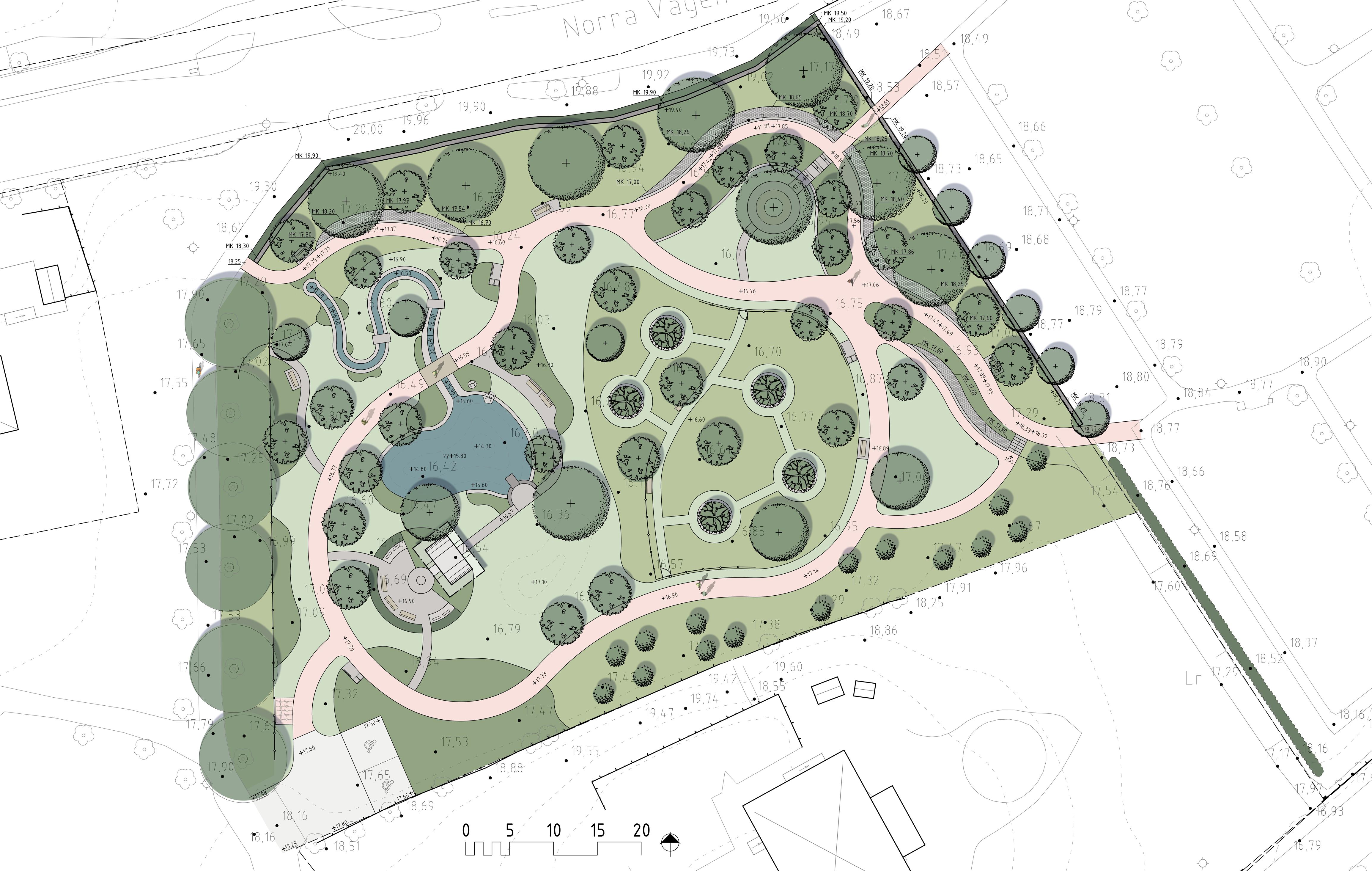 Ritningen, som är gjord av Tyréns i Jönköping, visar ett böljande landskap med mjuka, runda former, slingrande gångar, stenmurar, gärdesgårdar och blomstrande ängar.
