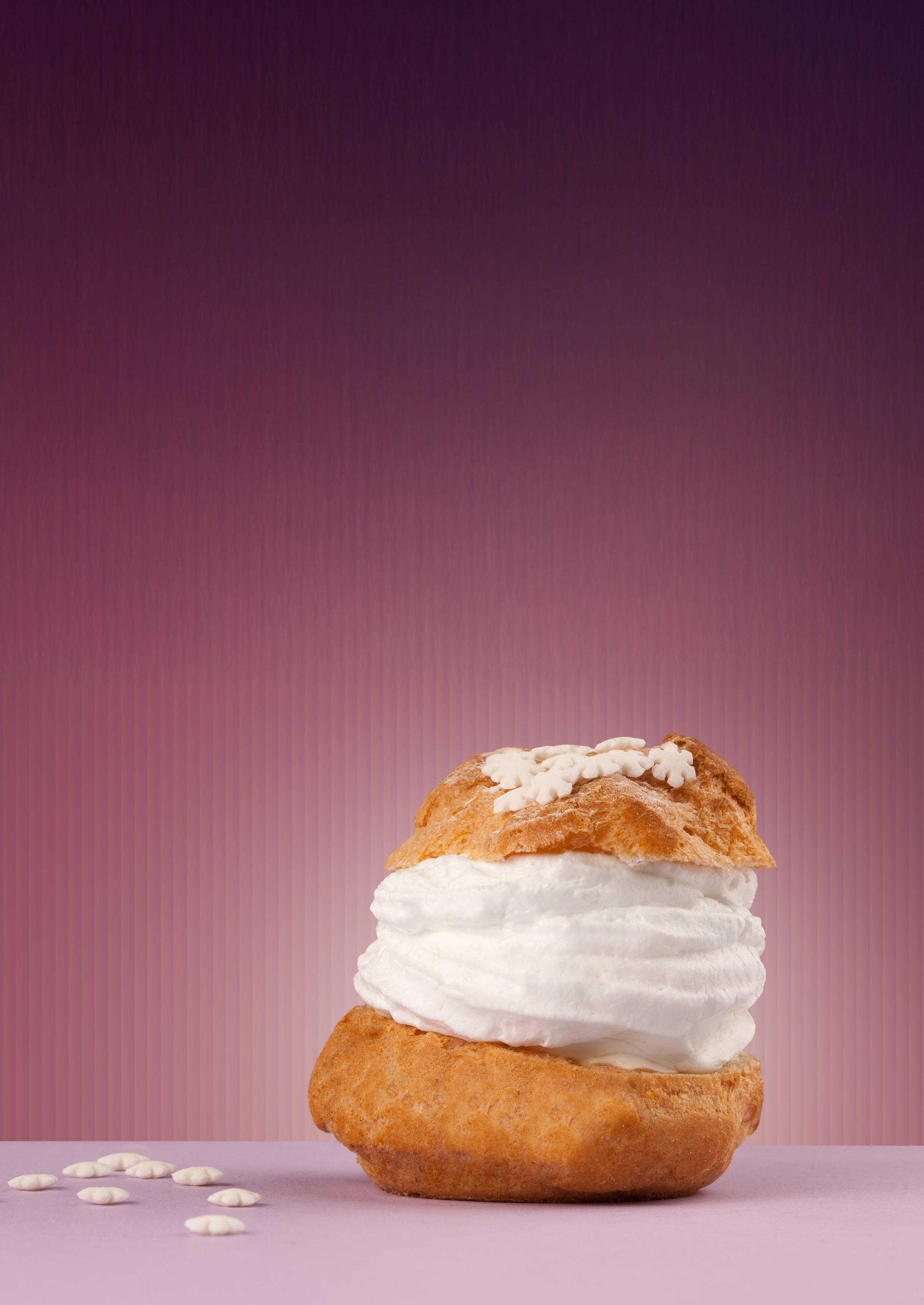u Skär varje rulle i 4 bitar och ställ eller lägg dem på ett fat. Toppa med grädden från spritspåsen. Pudra gärna över lite florsocker.