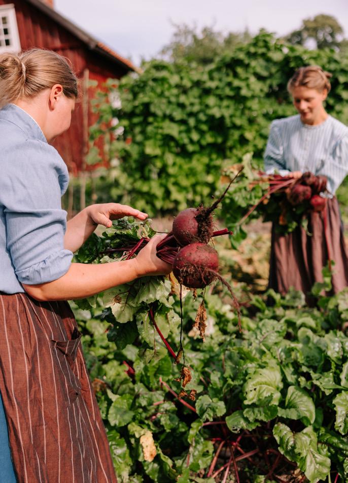 – Den som var husmor i en sådan här by hade viktiga uppgifter. Bland annat att ta hand om skörden på olika sätt – lägga in, röka, syra, torka, förvara. Även kött och ägg behövdes tas om hand. Det gällde att hushålla med maten som skulle räcka till alla under vintern. Just vid den här tiden på året var det därför mycket spring mellan köket och trädgården, säger Frida.