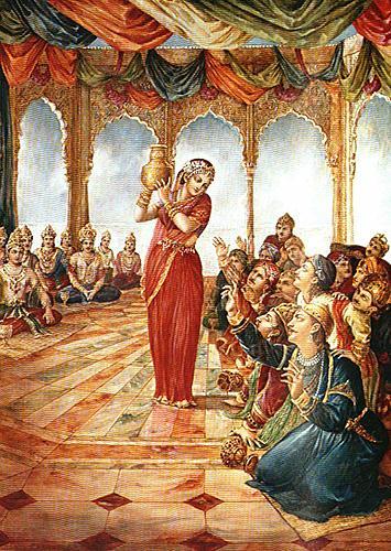 прак-мукхешу — когда обратившиеся лицом к востоку; упавиштешу — севшие; сурешу — полубоги; дити-джешу — демоны; ча — и; дхупа-амодита-шалайам — на арене, полной благовонного дыма; джуштайам — украшенной; малйа-дипакаих — светильниками и гирляндами из цветов; тасйам — на той; нара-индра — о царь; карабха-урух — та, чьи бедра напоминают слоновьи хоботы; ушатдукула — обернутых чудесным сари; шрони-тата — из-за широких бедер; аласа-гатих — медленно ступающая; мада-вихвала-акши — та, взгляд которой постоянно в движении из-за юного задора; са — она; куджати — звучащая; канака-нупура — ножных колокольчиков; шинджитена — позвякиванием; кумбха-стани — та, чьи груди подобны кувшинам; каласа-паних — с сосудом в