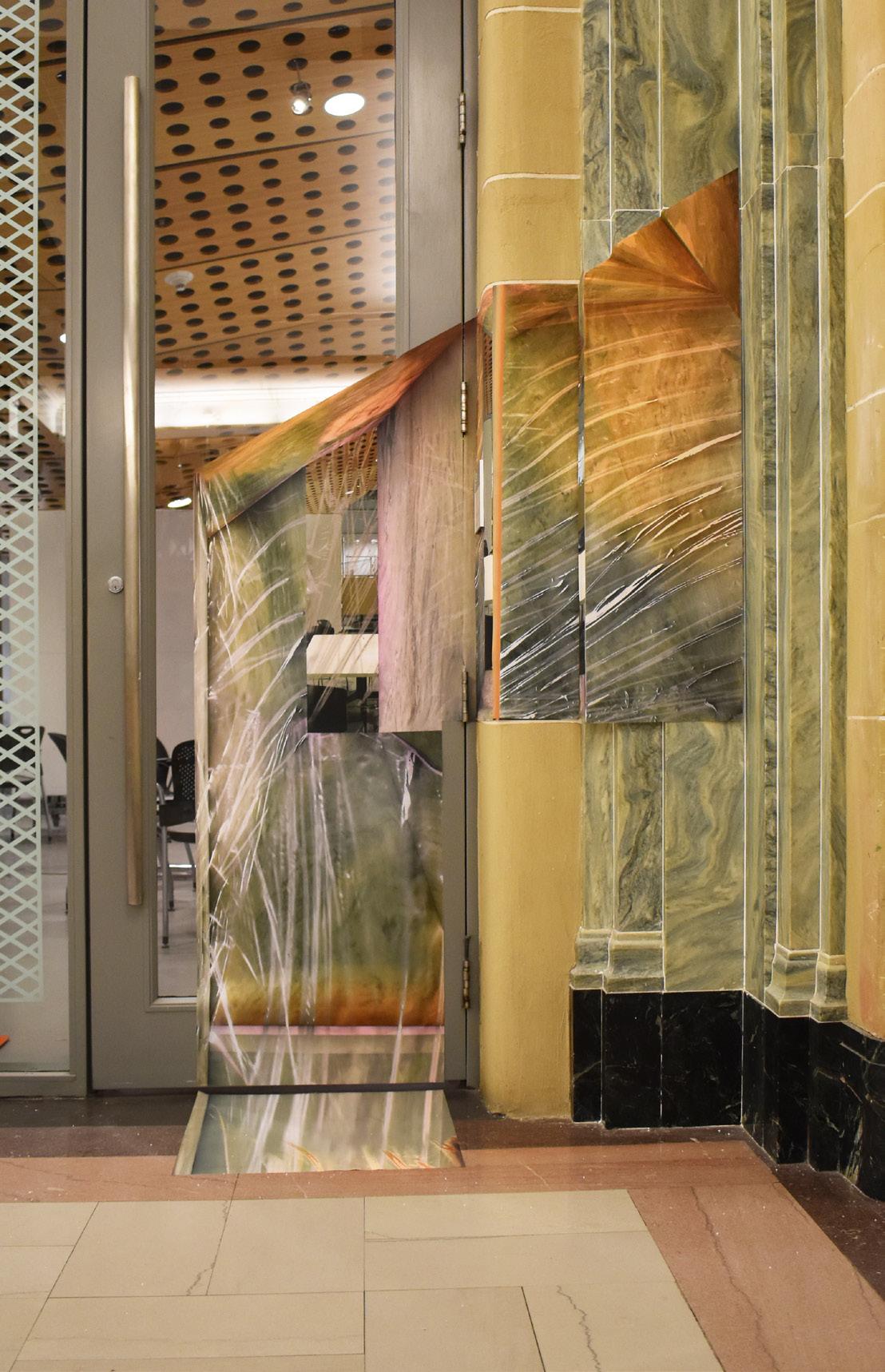 (Current page) This piece is part of the Stephanie Lin Beyond the Surface Workshop exhibition held in the Slocum atrium in Syracuse University. Each participant selects a corner as the site for a digitally fabricated world. Views are created into a two dimensional drawing, where they are printed and displayed as a three-dimensional spatial installation on chosen corners as “windows”. This piece attempts to appropriate the program and material of the Slocum Hall Atrium and the studio behind it. As the marbling from the right gets larger and plastic wrap covers the marble surface along with the warm light, the marble turns from rich to rotten. Furthermore, the printed view attempts to show the view from a 5’2” person standing by the door.