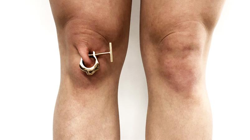 “Ouch!?!”- A three-scale C-clamp series reveal spots on the body with low nerve endings. When these pieces are worn on the designated body parts it is painless to pinch but so painful to bend. The form of the jewelry echoes the thick and melting form when the body is pinched. This set speaks to jewelry as ornamentation and instrument by stifling the body’s movement physically and measuring the amount of skin with low pain receptors, respectively.