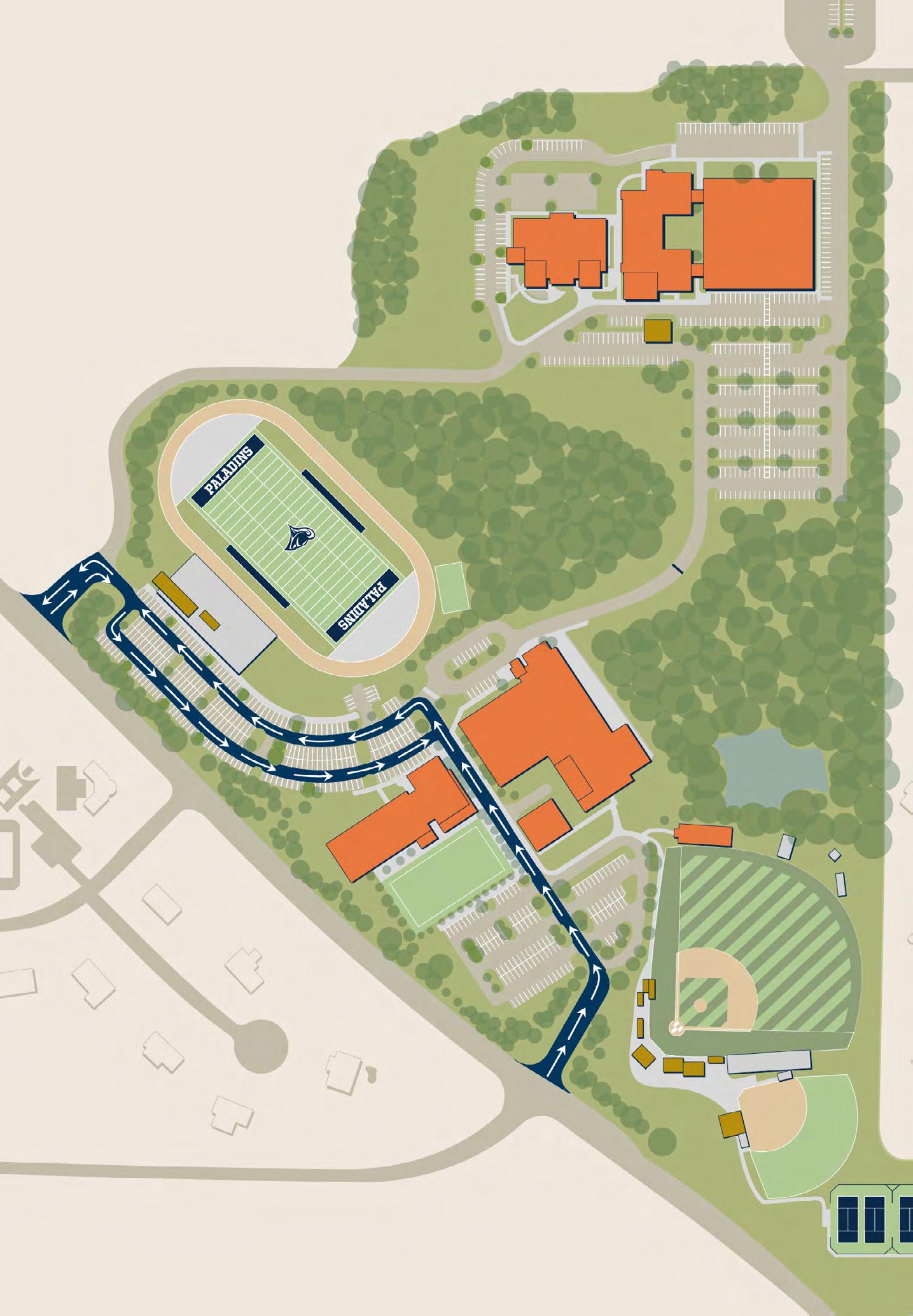 If you drop off middle school siblings, you may drop your children off together in the middle school carpool line at the Elementary School's main office via the Jones Road entrance. Your high school students will have access to sidewalks and monitored crosswalks, providing them with a safe route to the high school. Alternatively, you may drop your middle school student off in middle school carpool and proceed along Paladin Parkway to enter the HS carpool line.