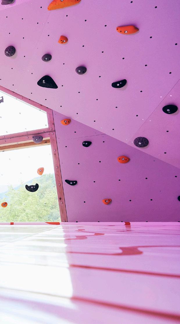 The largest glass bouldering wall in the world! With a total of 188 m 2 climbing surface and a substructure made of solid wood, the Wallberg Wall is a paradise for boulder fans. Approximately 64 m 2 of the climbing surface consists of Plexiglas in front of a window. The rest of the wall is made out of sanded multiplex panels. Over 1000 climbing holds in various colors and shapes provide adrenaline and climbing fun. Specially designed fall protection mats with contour lines of the surrounding mountain landscape gently cushion any fall.