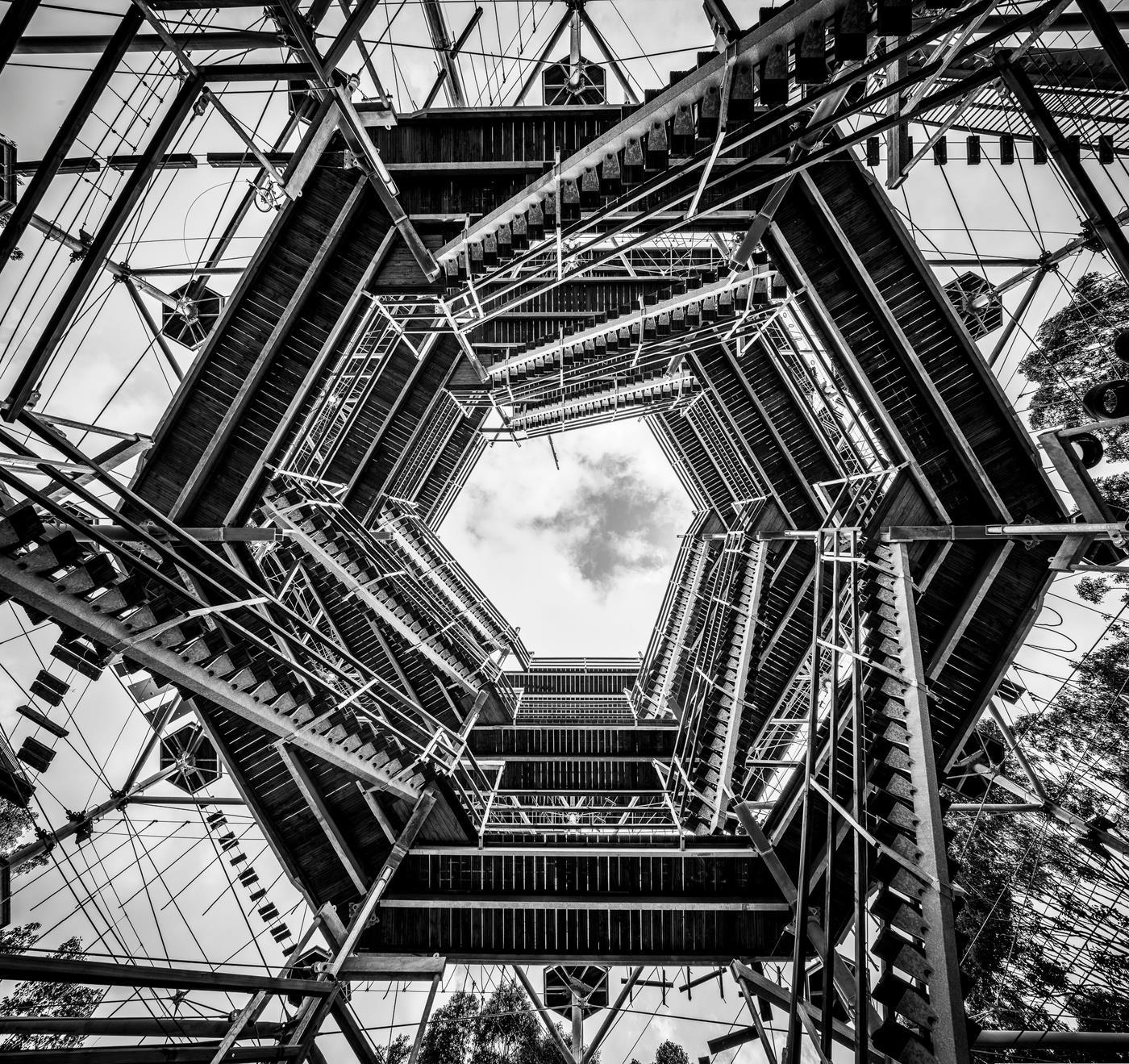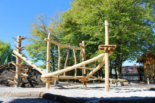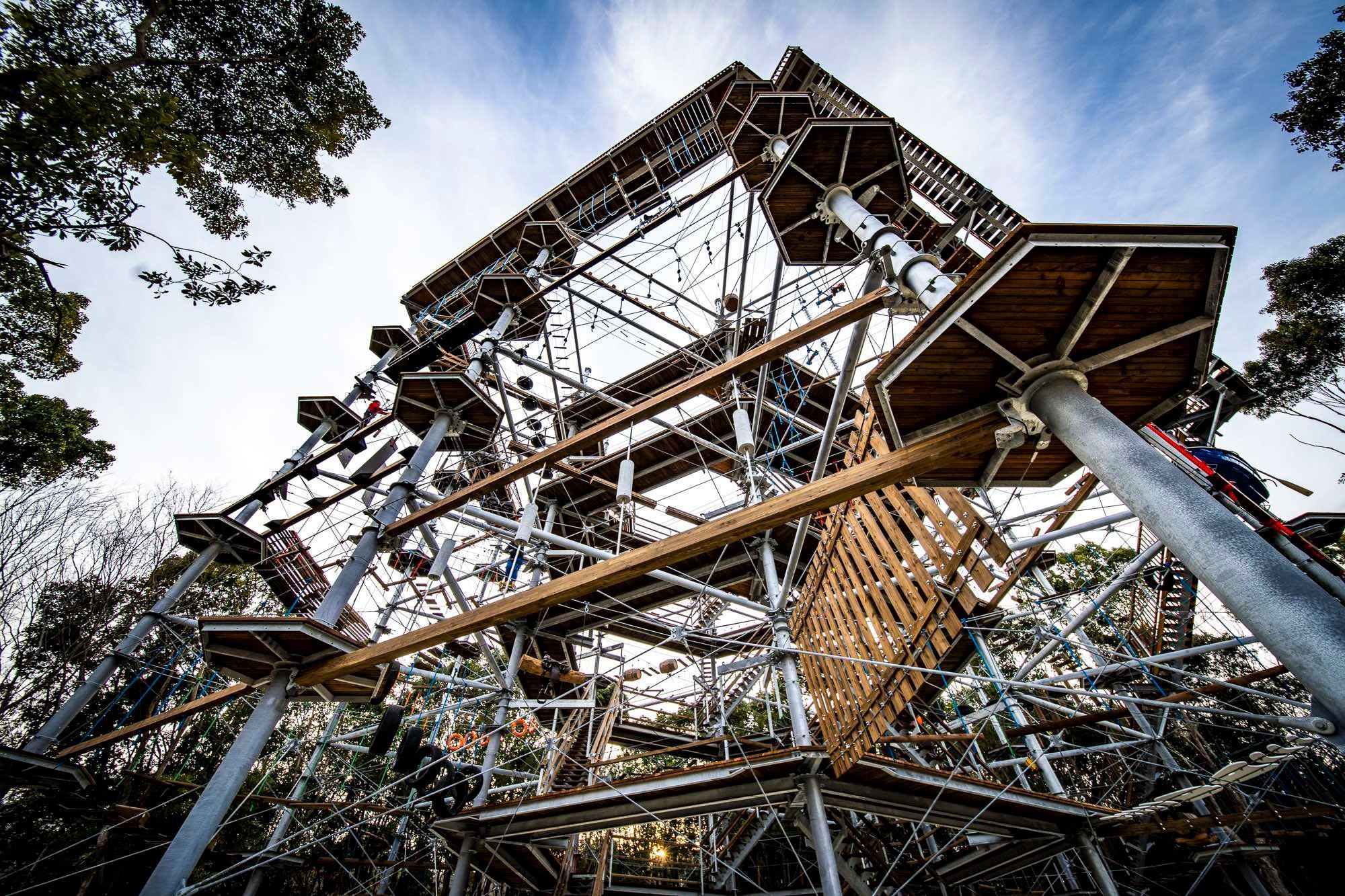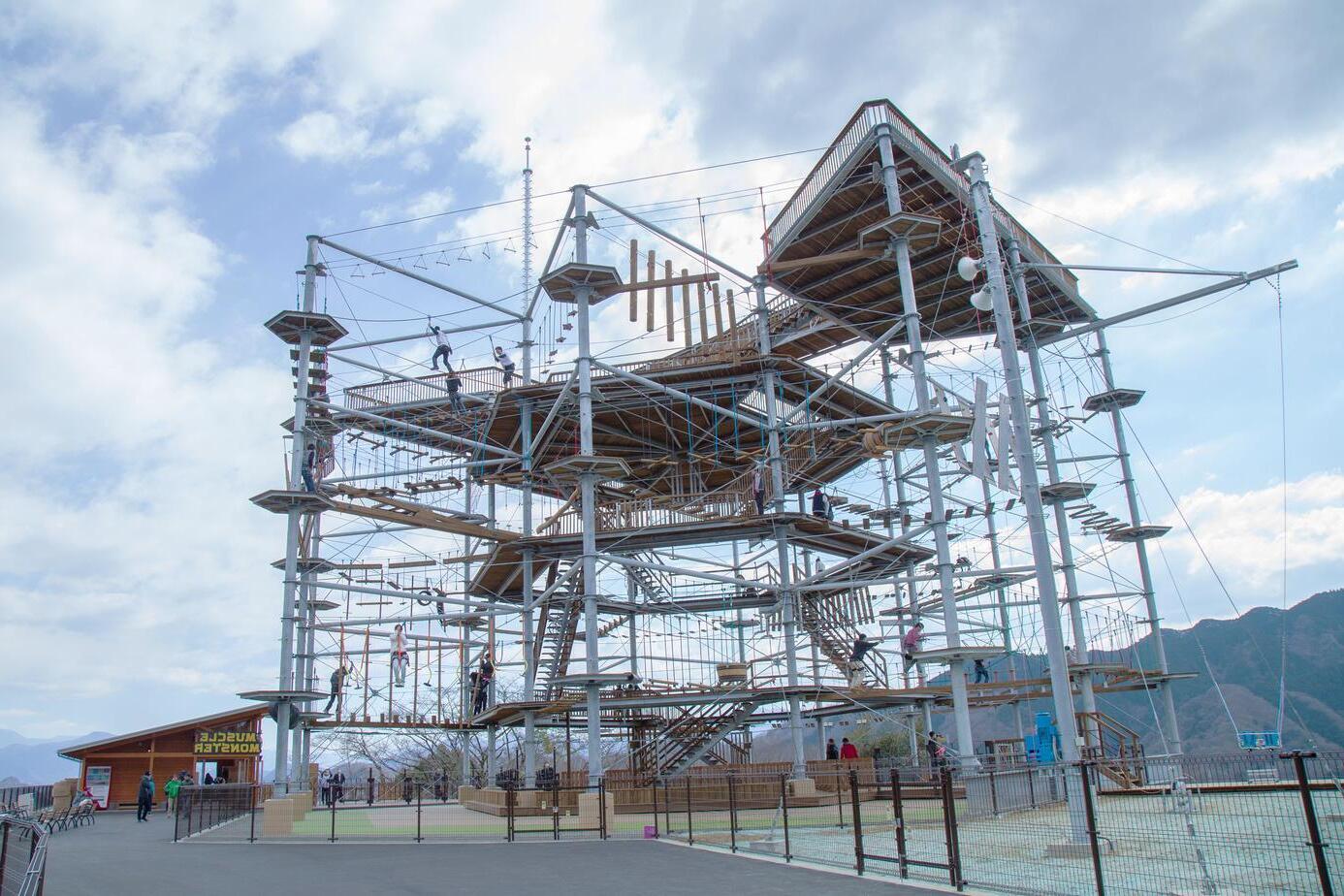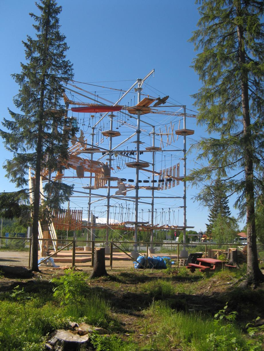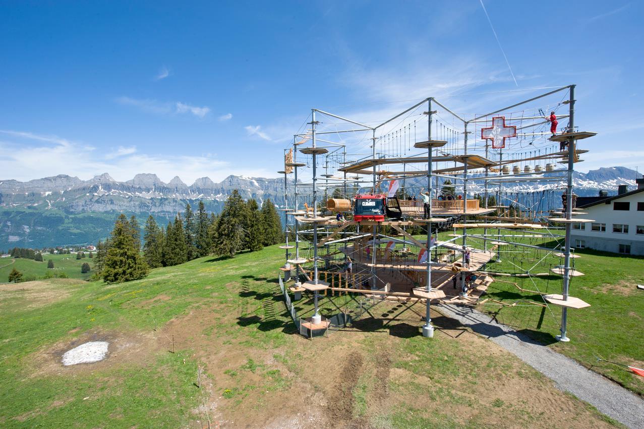 共设有90个攀爬元素,分布在三层,配有活动平台、滑索、攀岩墙、 巨型秋千和一个额外的19个攀爬元素的儿童攀爬区。在山顶稳定地
