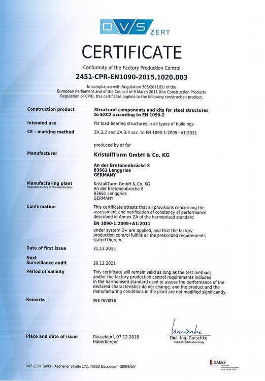 来自TUV的型式批准报告,DVS Zert证书符合工厂生产的要求,证明我们的钢结构结构组件和套件符合欧盟规范。