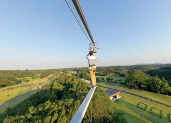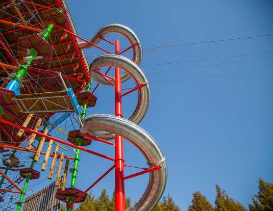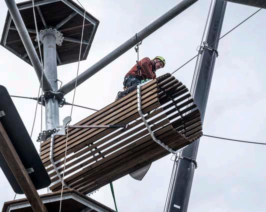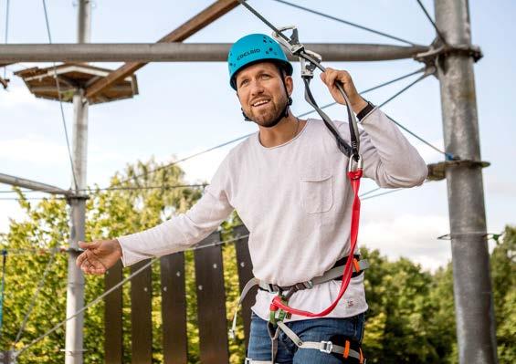El Circuito de cuerdas altas se utiliza como una especie de vía ferrata artifi cial. Mediante un sistema de seguridad compuesto por dos mosquetones conectados, los escaladores están continuamente asegurados a un cable de acero. Simplemente cambiando los mosquetones, los visitantes pueden elegir su propia ruta según el nivel de difi cultad, sin una dirección de movimiento predeterminada. Esto signifi ca que no hay atascos ni tiempos de espera.