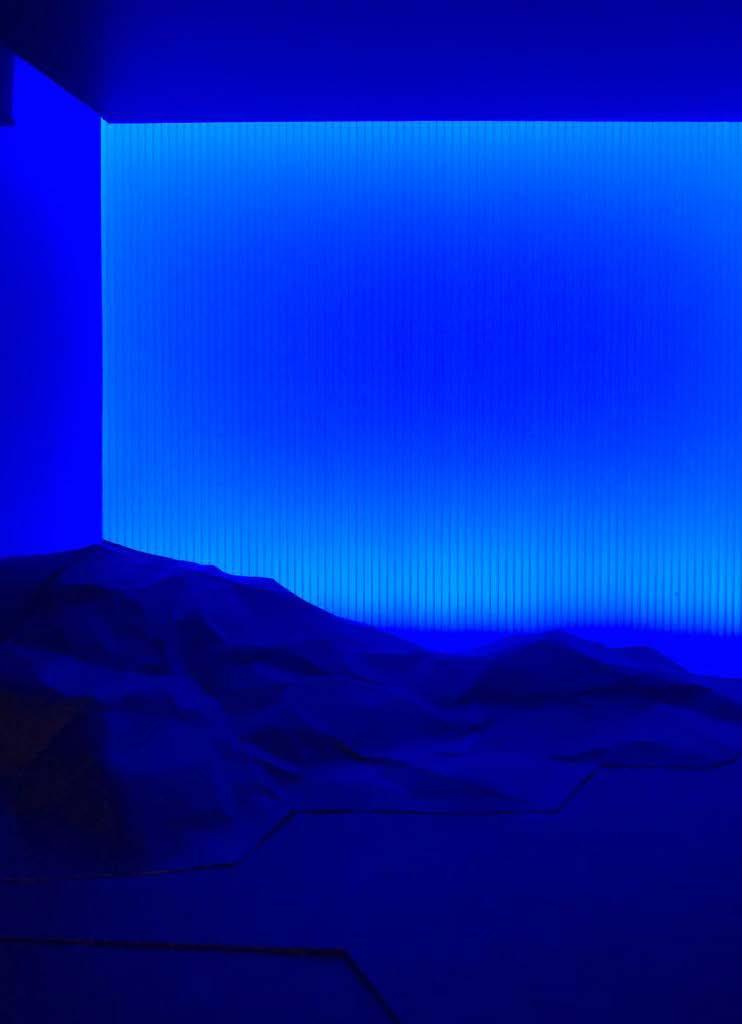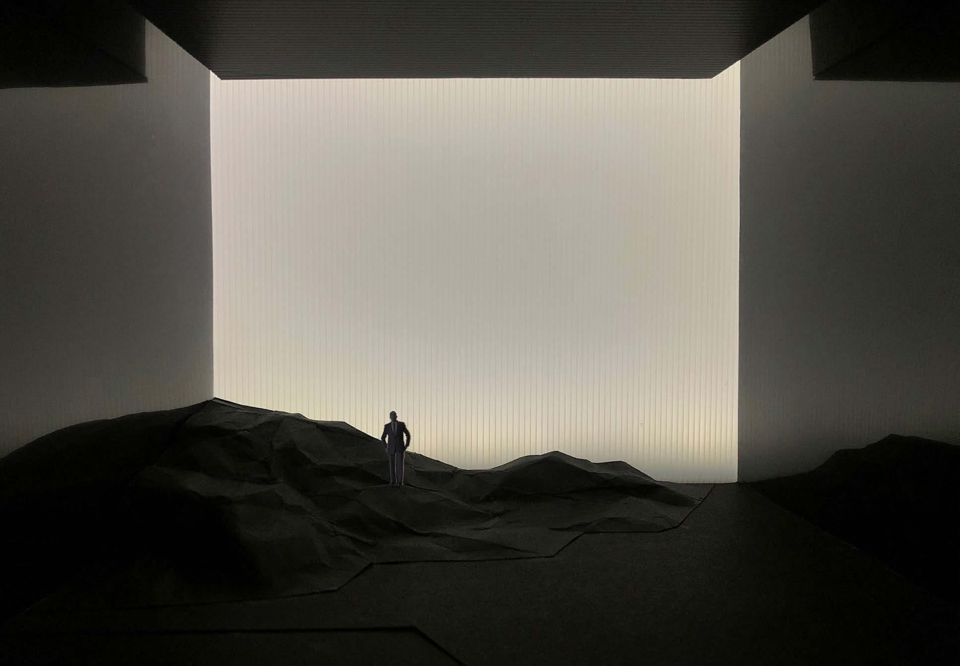 The phisical model has been created out of cardboard, polycarbonate, mirrored surfaces, folded cardboard to create a polygonal mesh for the landscape on the background.