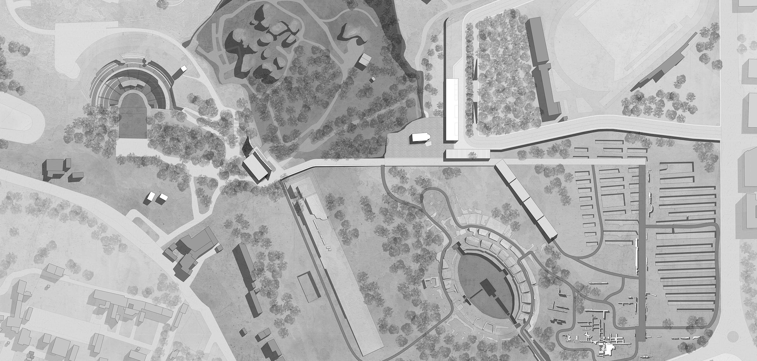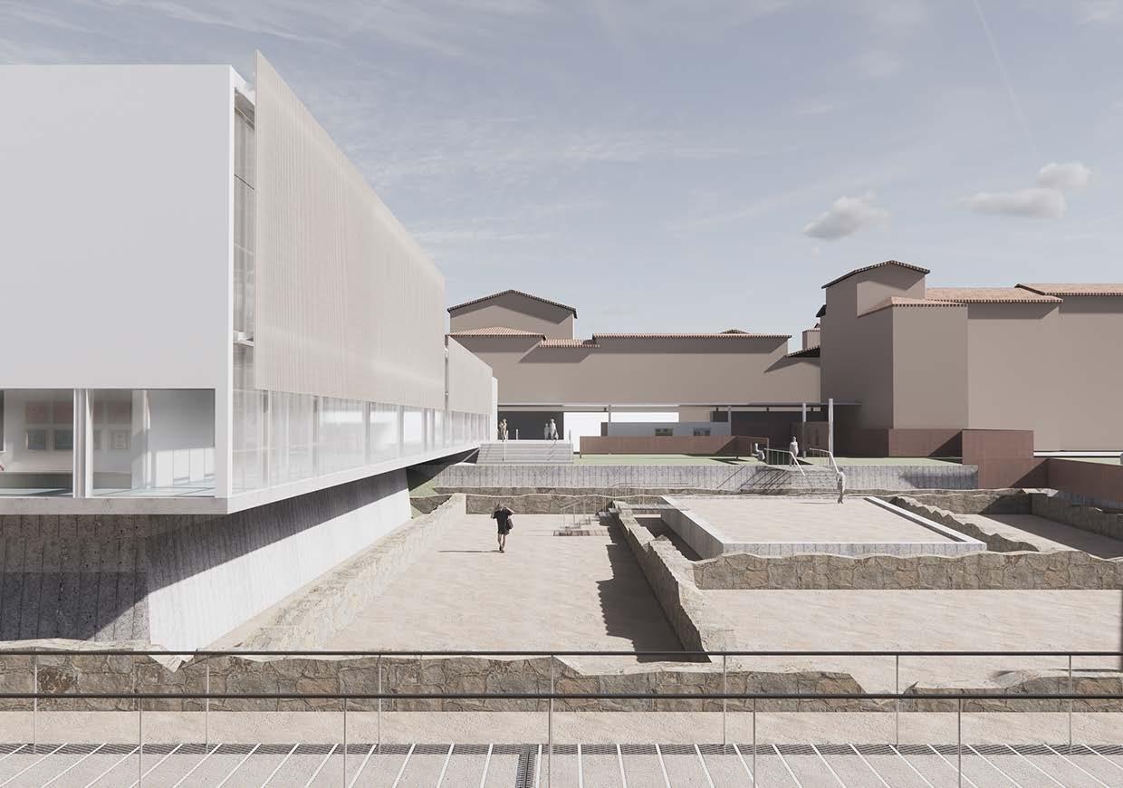 The design involves a series of buildings including a covered market for locals, a cafeteria and a conference room, linked by a path both geometrical and organic, creating a sense of rediscovery of the ancient place.