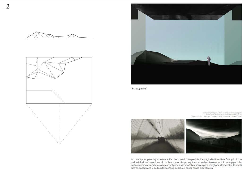 The Scenography model has been inspired by the architect and designer Achille Castiglioni, who has designed tons of temporary exhibitions and pavilions for Triennale di Milano in the 60s and 70s, together with his brother Pier Giacomo. The concept of light and atmosphere has been here enhanced and developed in order to create a onirical, unreal space - such has his own work in the exhibitions he made - in which a modular structure is positioned.