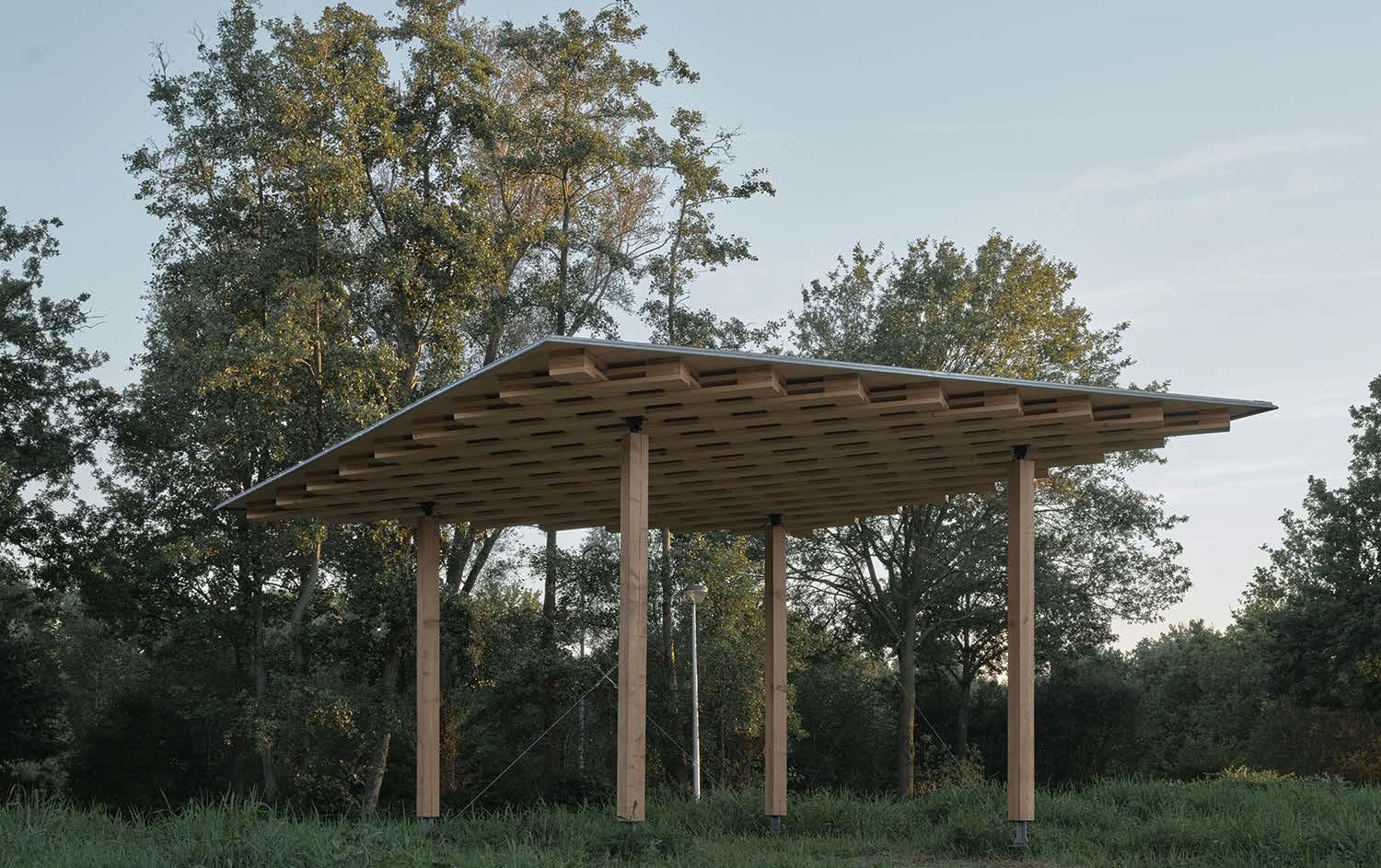 The architecture, robust yet unassuming, relies on a layered composition of elements: floor, post, and canopy. Brick paving forms the platform’s perimeter, evolving into functional furniture. Wooden posts are strategically positioned, creating a rhythmic pattern and supporting a gently curved canopy made of woven planks. Together, these elements fashion welcoming spaces that interact harmoniously with their surroundings, demonstrating versatility through subtle adjustments while maintaining a cohesive and identifiable aesthetic.