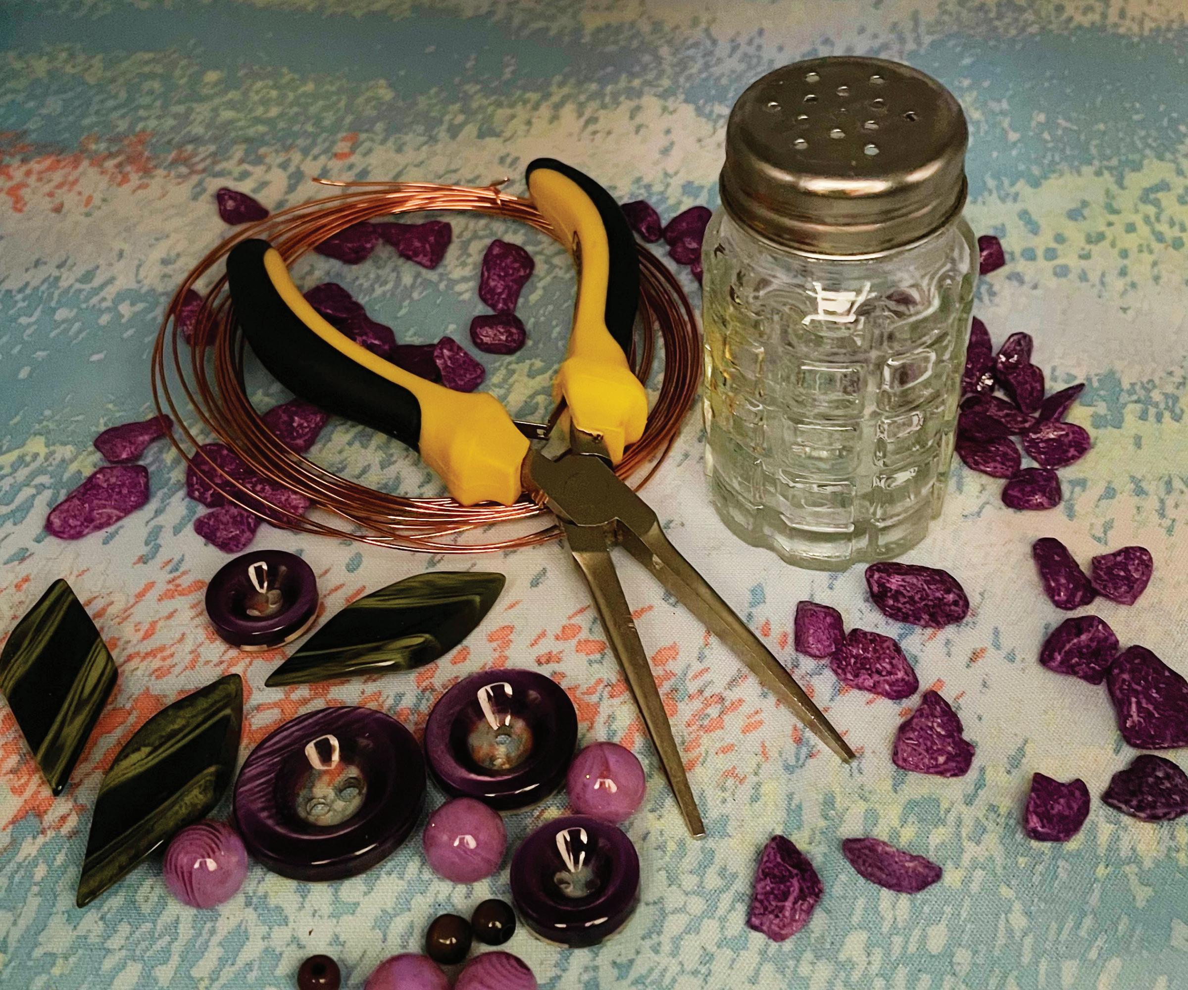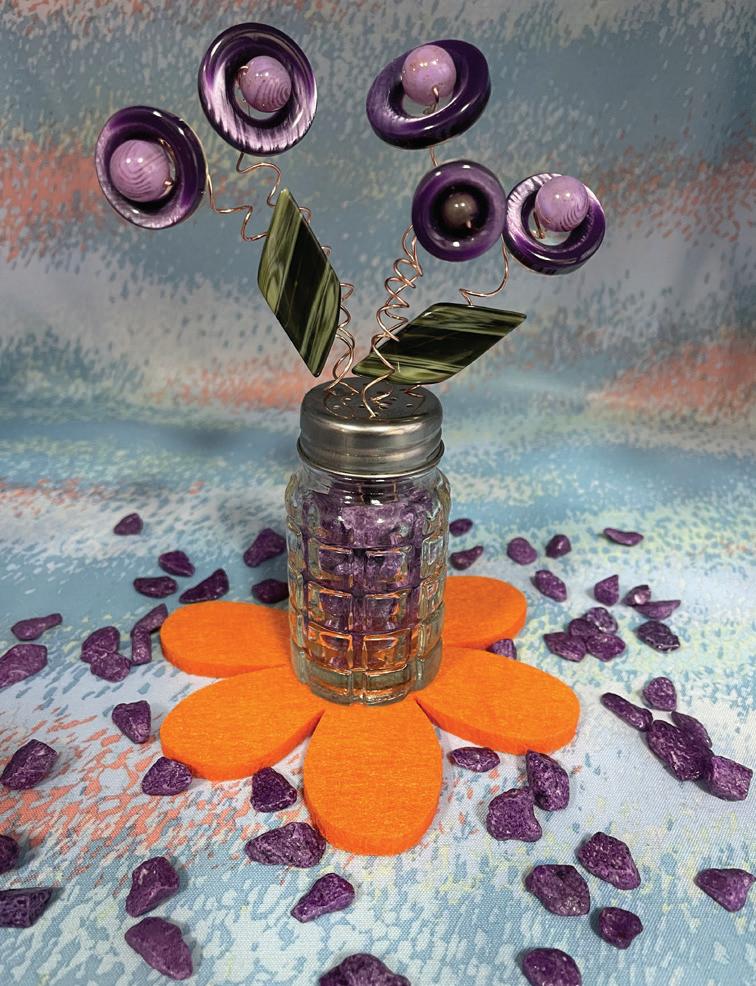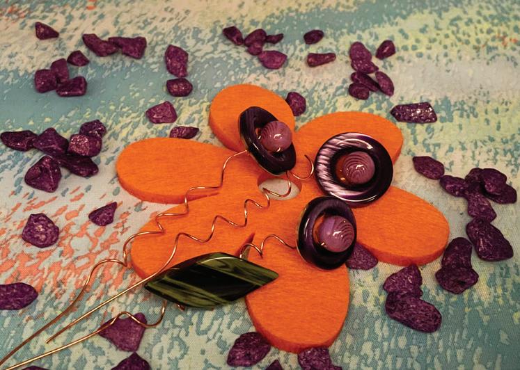І НОЕМВРИ 2022 72 С ЕМЕЙСТВО #направи си сам с ЕлиНика Здравейте, малки, големи и пораснали творци! Наскоро попаднах в една кинкалерия и буквално се изгубих сред пъстрото многообразие от форми и цветове на копчетата. Не можах да устоя на изкушението и купих шепа копчета, които ще превърна в цветя, а за ваза ще ми послужи стъклена солница. Необходими материали: > стъклена солница > медна тел 0,8 мм > малки декоративни камъчета Ваза с цветя от копчета > копчета > мъниста (по желание) > малки клещи, тип крокодил > клещи–секачи (по желание)