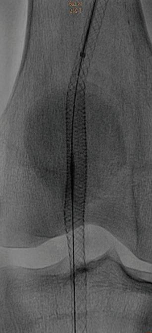 дезиле, десен антерограден феморален достъп. Пунктирахме под флуороскопски контрол (Road map). A. femoralis comunis dextra бе третирана с балонна дилатация, но a. poplitea беше силно калцирана, с тъп проксимален чукън и страничен клон (колатерал), съседен на оклузирания сегмент.