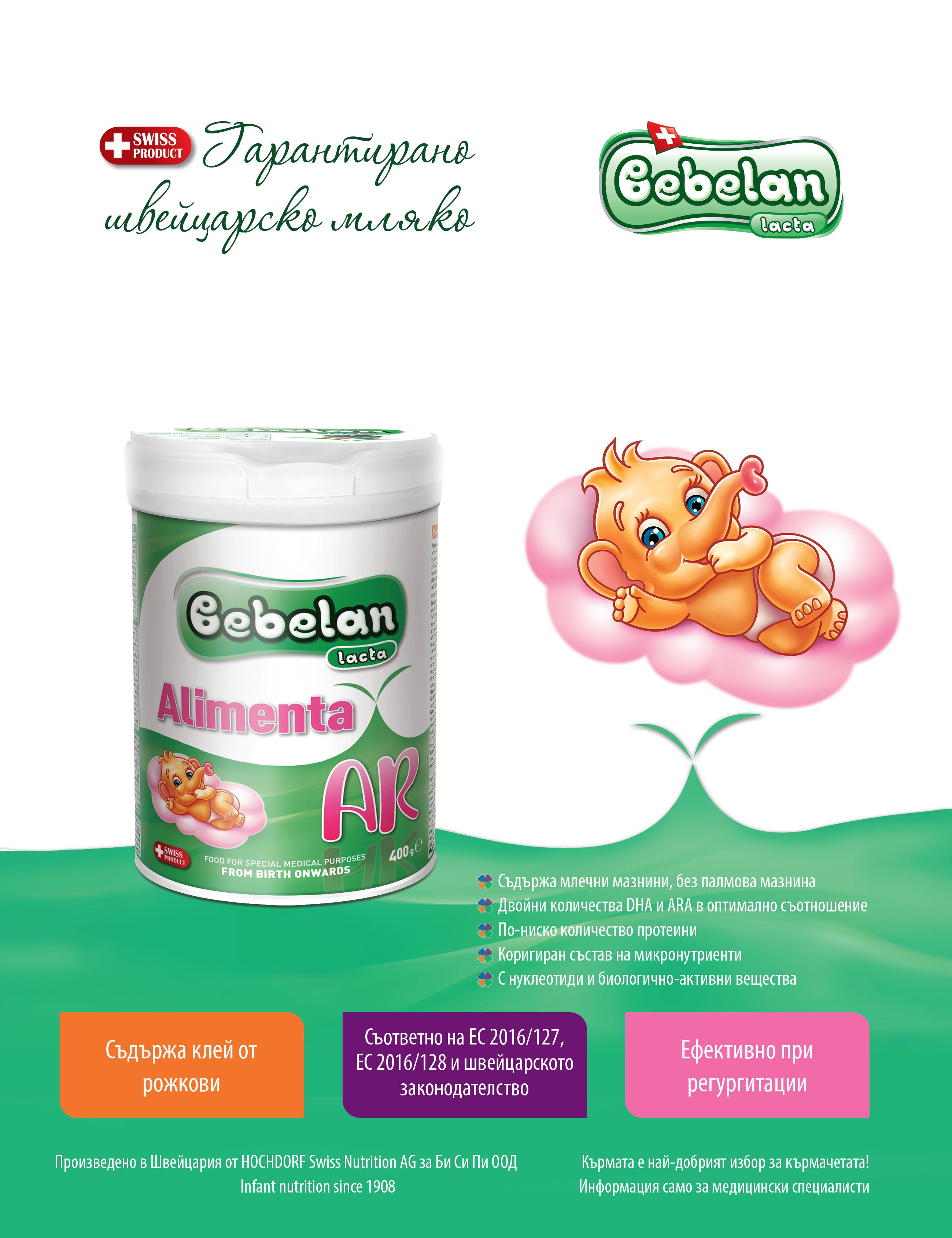 достигат до 160 ксал/кг, а при тези с хронични заболявания в резултат от недоносеността им - 180-200 ксал/кг. Адаптираните млека за недоносени съдържат по-голямо количество белтъци, които са основен анаболен елемент; повече калций, фосфор и желязо. И тук ще отворим скоба, че кърмата на собствената майка е най-добрата храна за недоносеното новородено дете. Често обаче тя не е достатъчно „хранителна”, за да задоволи нуждите на недоносеното дете, особено на тези които се раждат преди 32 г.с. и тегло под 1500 гр. Разполагаме с обогатители за кърма, благодарение на които тя става по-високо калорична, за да задоволи високите енергийни потребности на тази група деца. Ползването на тези АМ се препоръчва до 2 мес. корегирана възраст, а при екстремно недоносените под 1000 гр. - до 5-6 мес. корегирана възраст. Антирефлуксни формули (AR). Касае се за физиологичен процес на връщане на приета храна от стомаха към хранопровода и пасивното й изтичане през устата. Процесът е пасивен, не изисква енергия и мускулна работа. Дължи се на физиологичен хипотонус на ДЕС (долен езофагеален сфинктер). Състоянието най-често продължава до 4-5 месечна възраст, когато се подобрява тонуса на ДЕС и рефлуксът спира. През цялото време детето е в добро състояние и с адекватно наддаване на тегло. При определени случаи на по-силно изразен рефлукс и лошо наддаване се налага включването на антирефлуксни млека, сиропи и антирефлуксна поза. Антирефлуксните формули съдържат сгъстител. Може да бъде картофено нишесте, клей от Рошкови или друг с доказани ползи за предотвратяване на регургитациите. Необходима е консултация с педиатър/неонатолог преди започване приема на тази формула. Хипоалергенни формули (Н.А.): Хипоалергенните формули са частично хидролизирани формули, които се използват за превенция на алергиите, както и при деца с атопичен терен (напр. атопичен дерматит), или със семейна предиспозиция, където единият или и двамата родители са с алергия. Формулите могат да се приемат и от деца, които нямат семейна предразположеност, като превенция. Приложението им е показано при: повръщане, диария, кръв в изпражненията, кожни обриви, лош тегловен прираст.