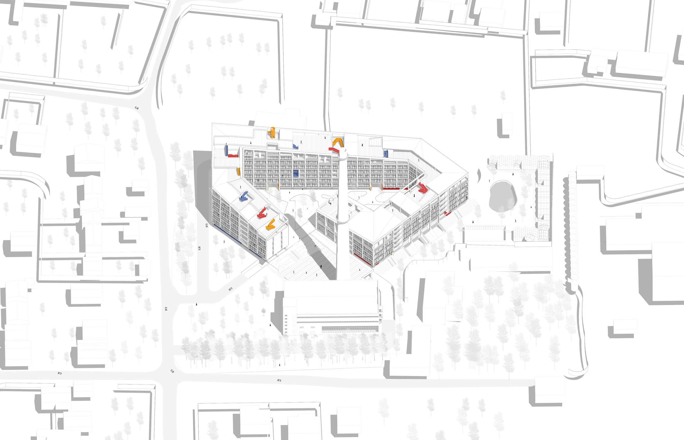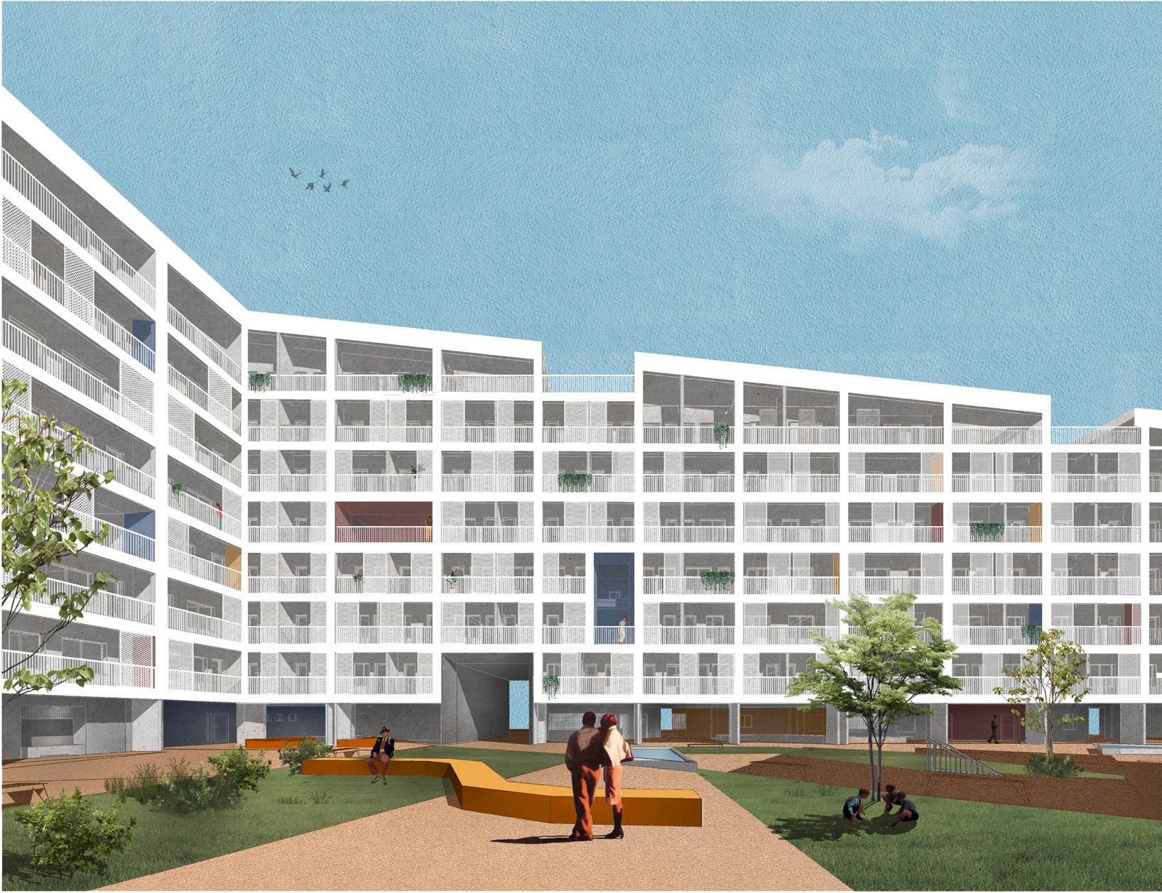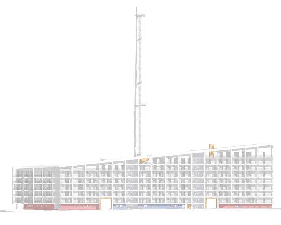 Concept | The design concept embraces the principles of the city’s new master plan while enhancing the existing urban fabric. The project focuses on reusing the historic boiler house structure and integrating it into a comprehensive residential scheme that caters to diverse housing needs. The design emphasizes simplicity and functionality, utilizing a standard reinforced concrete framework with dimensions of 6.6m x 6.6m to ensure ease of construction and adaptability.