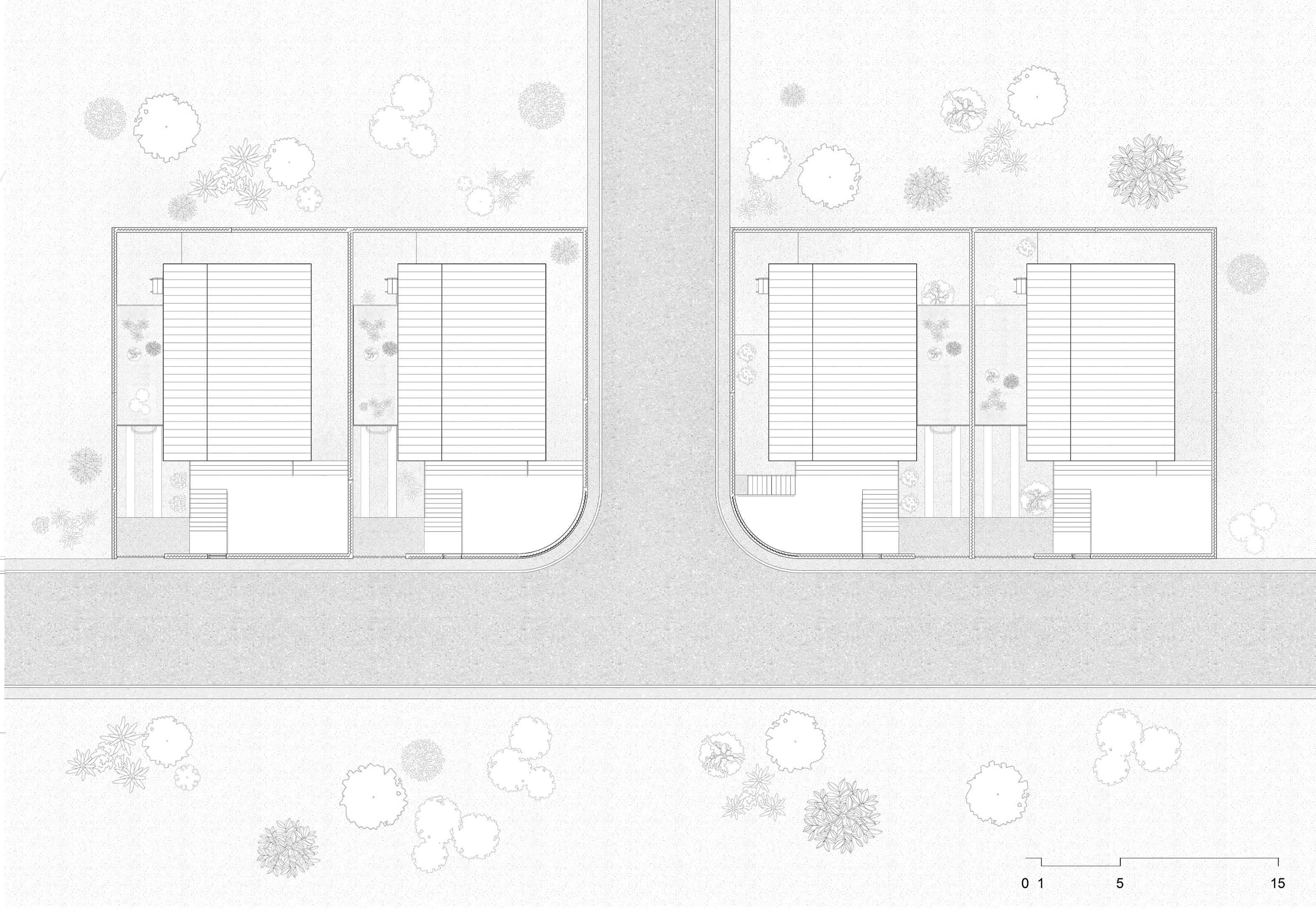 Spaces | Each residence spans 180 square meters and is organized over two levels plus a basement. The layout ensures privacy while maintaining a cohesive architectural theme.