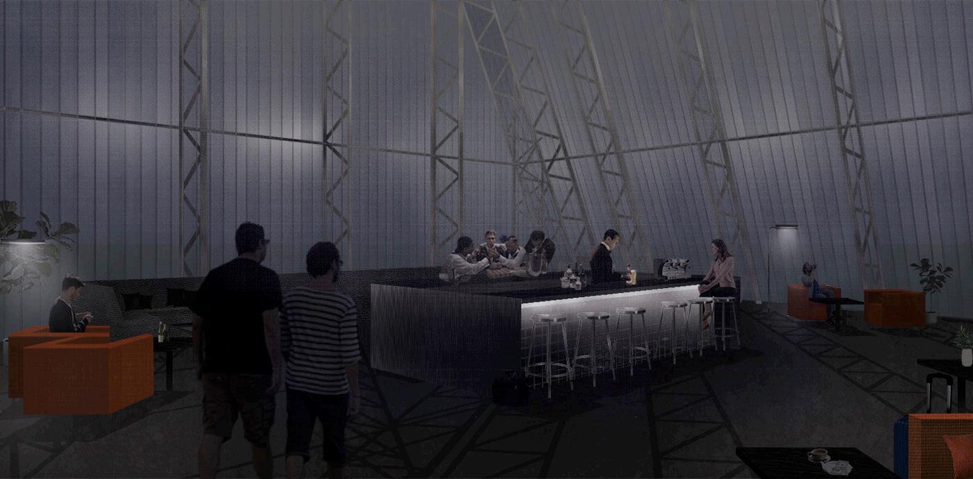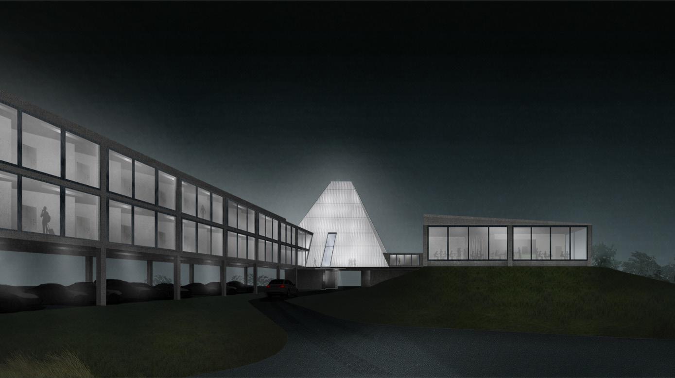 The core concept of the Light Spot is to address the area’s deficit in lighting while providing a functional and engaging roadside facility. The design features a striking pyramid-shaped block that houses the reception area and bar, designed to be both a visual landmark and a beacon of light. This central pyramid, with its soft, spread lighting, aims to create a welcoming atmosphere for travelers.