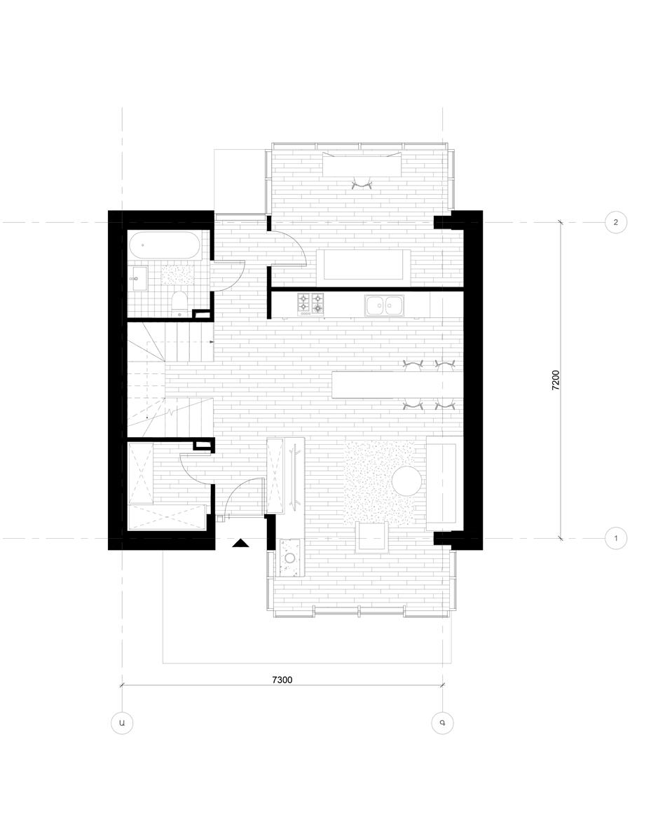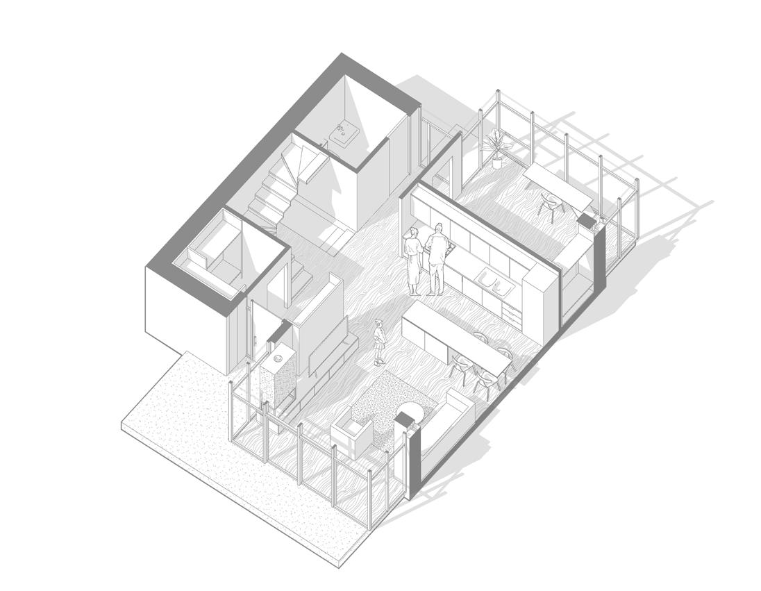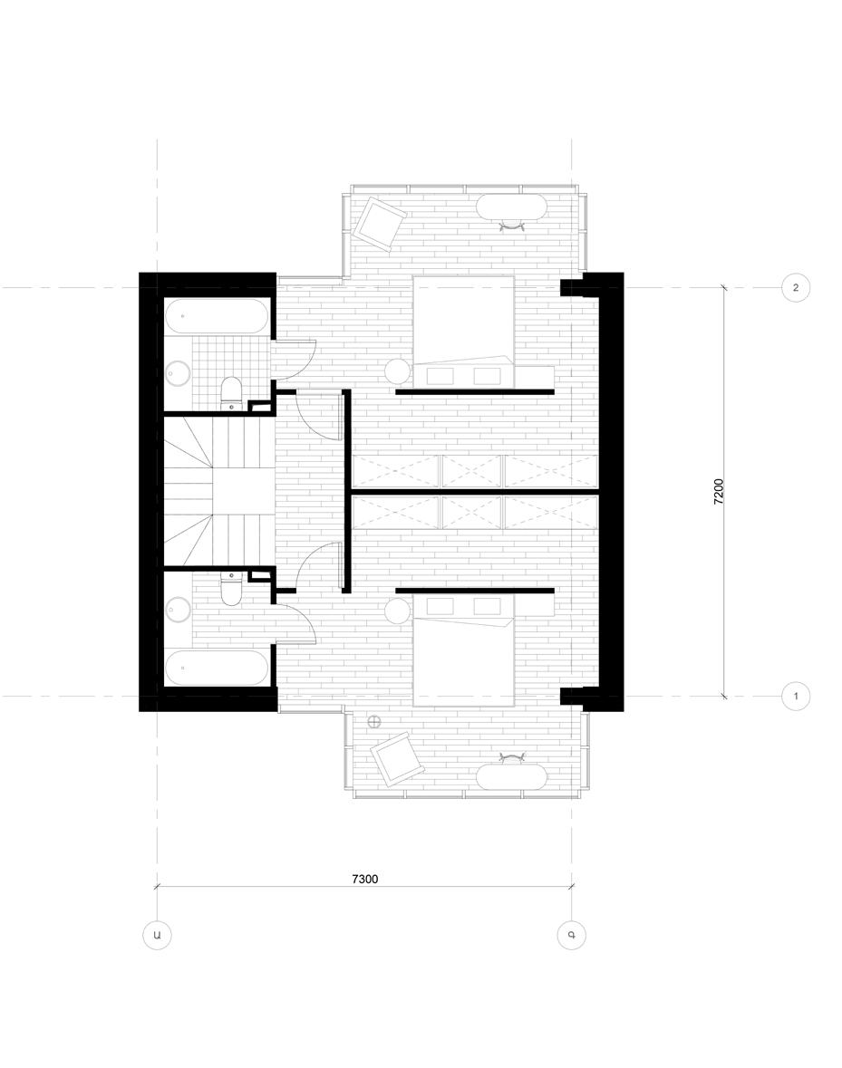 The first floor (p.27) features an open-plan kitchen and living room, designed to foster a sense of openness and connectivity. A central fireplace serves as both a functional heating element and a focal point, creating a warm and inviting atmosphere.The master bedrooms are situated on the second floor, offering privacy and elevated views of the surrounding landscape. The design ensures that the bedrooms are well-lit and comfortable, with strategic window placements to maximize natural light and scenic views. Each house includes a basement that provides additional space for storage, utility rooms, or potential recreational areas. Each residence is equipped with its own terrace and garden area.