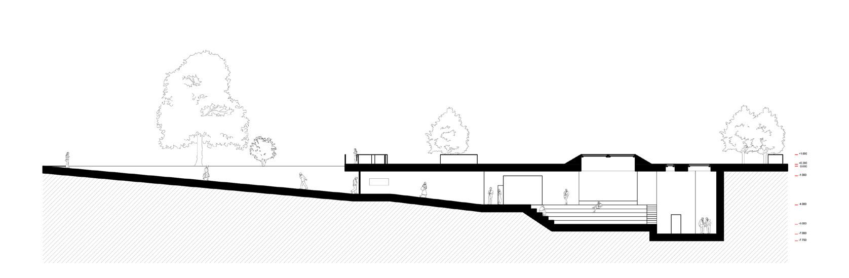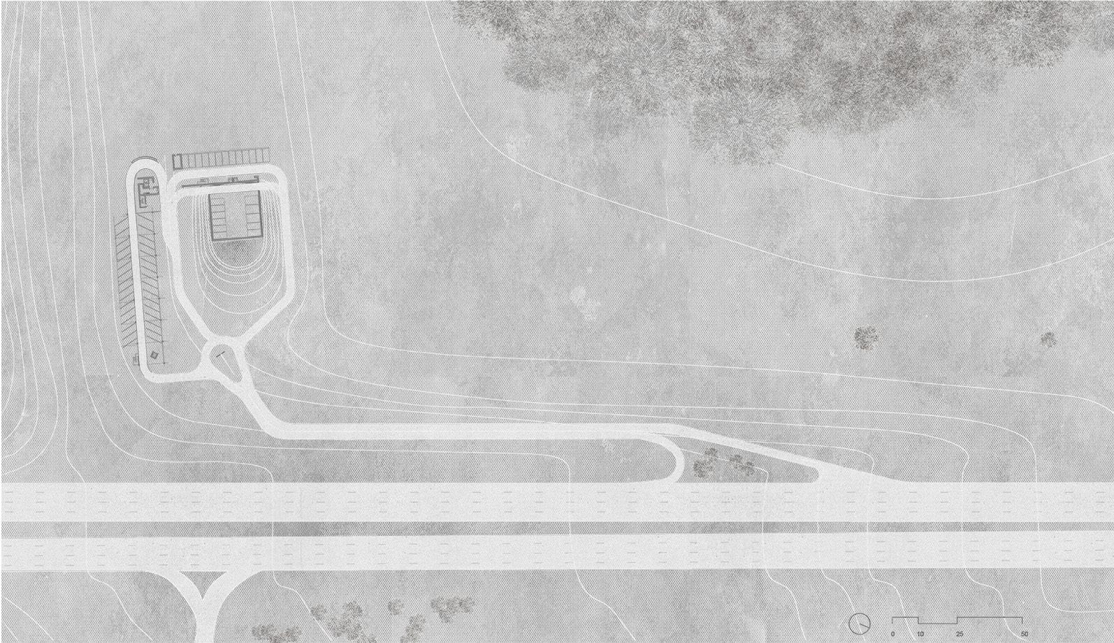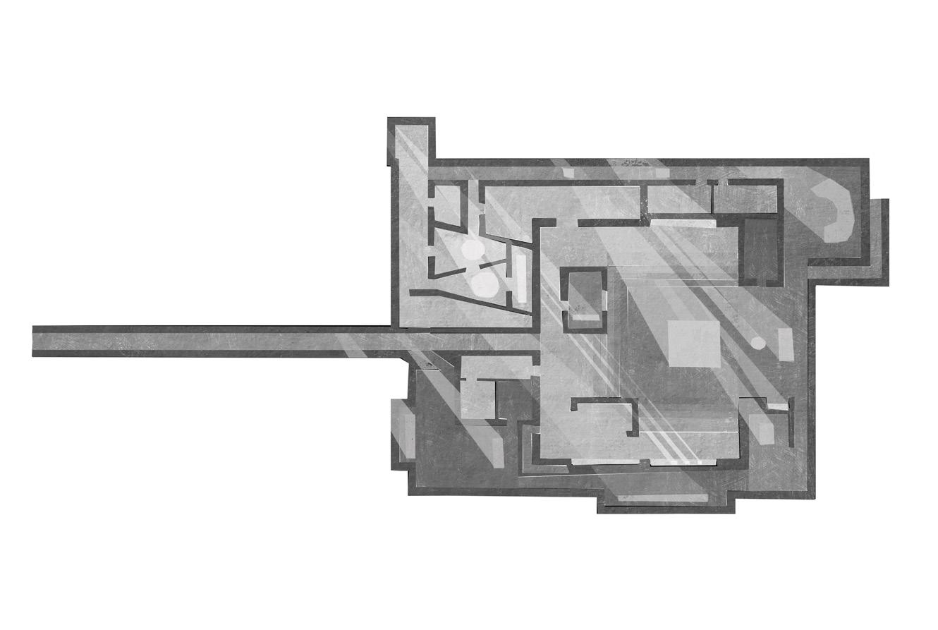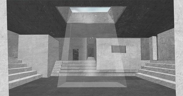Concept | The project explores the intersection of sensory experiences and spatial design through the creation of a multifunctional underground facility in Tsaritsyno Park, Moscow. The project transforms three distinct plots into an immersive, multi-sensory environment that caters to theatre, musical performance, and stargazing. The project aims to create a seamless flow between different functional areas, enhancing the overall immersion and engagement of users. The theatre is accessed via a long, winding entrance that heightens the sense of immersion as visitors transition from the park to the performative space. This approach creates a dramatic entry experience and prepares visitors for the sensory journey ahead.The theatre features a flexible performance area designed to accommodate various types of productions, including theatrical plays and musical performances. The space is designed to enhance acoustics and sightlines, ensuring an optimal experience for both performers and audiences.